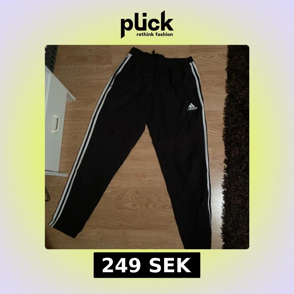 Säljer ett par svarta träningsbyxor från Adidas med vita ränder längs sidorna. Byxorna har en elastisk midja med snörning och är perfekta för sport och träning.