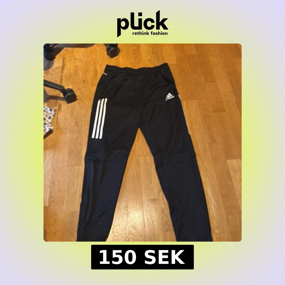 Säljer ett par svarta träningsbyxor från Adidas med vita ränder på sidan och logotyp på låret. Byxorna har en elastisk midja och dragkedjor vid anklarna för enkel på- och avtagning. Perfekta för träning eller en avslappnad dag.