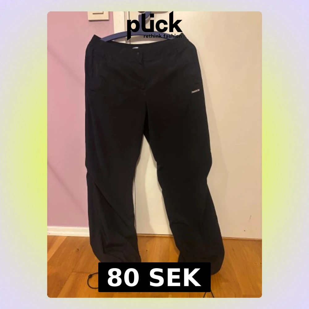 Svarta träningsbyxor från Reebok med diskret logga på höften. Byxorna har snörning vid bensluten och elastisk midja för skön passform. Perfekta för gymmet eller chill hemma. Materialet är lätt och syntetiskt. storlek L men passar mig som är S