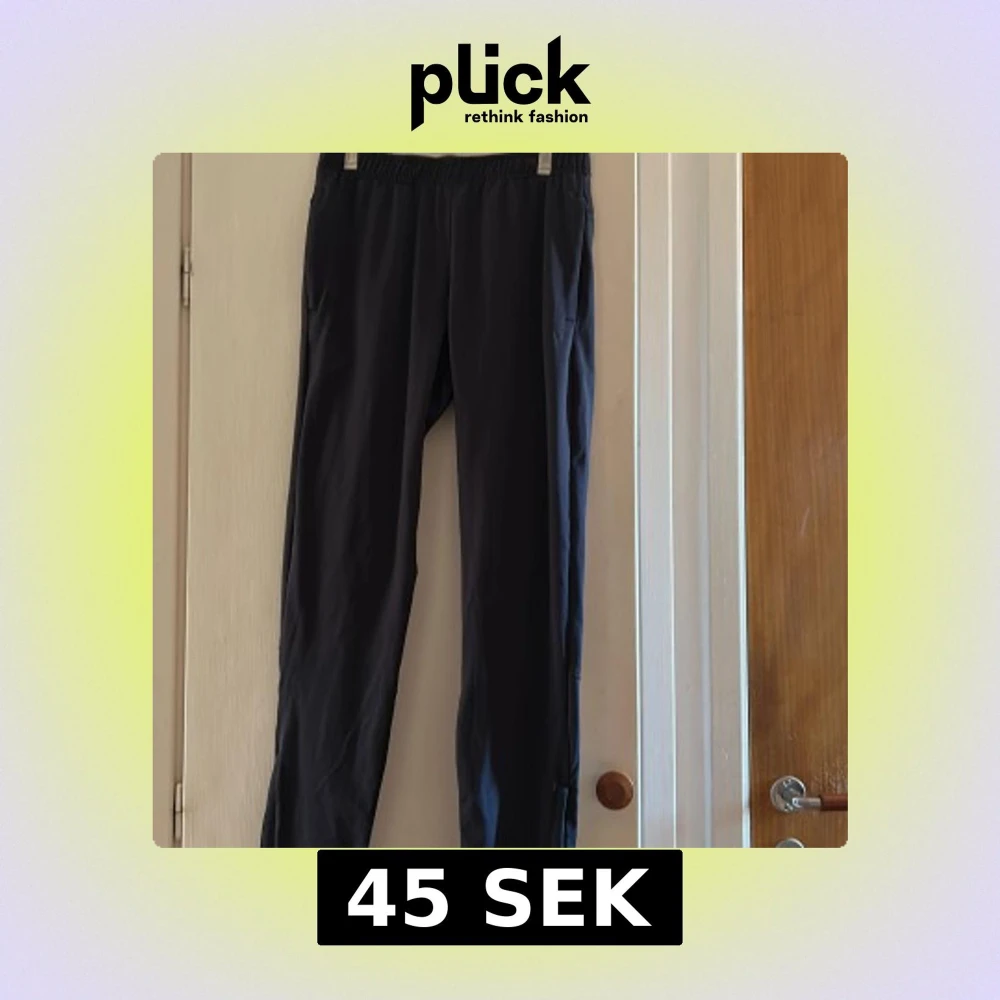 Svarta träningsbyxor med elastisk midja och dragkedjor både vid fickor och benslut. Snygg och enkel design i syntetmaterial som passar perfekt till träning eller chill. Byxorna har en normal passform och är lätta att röra sig i.