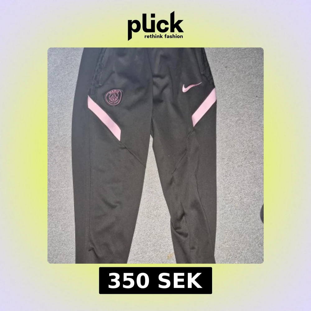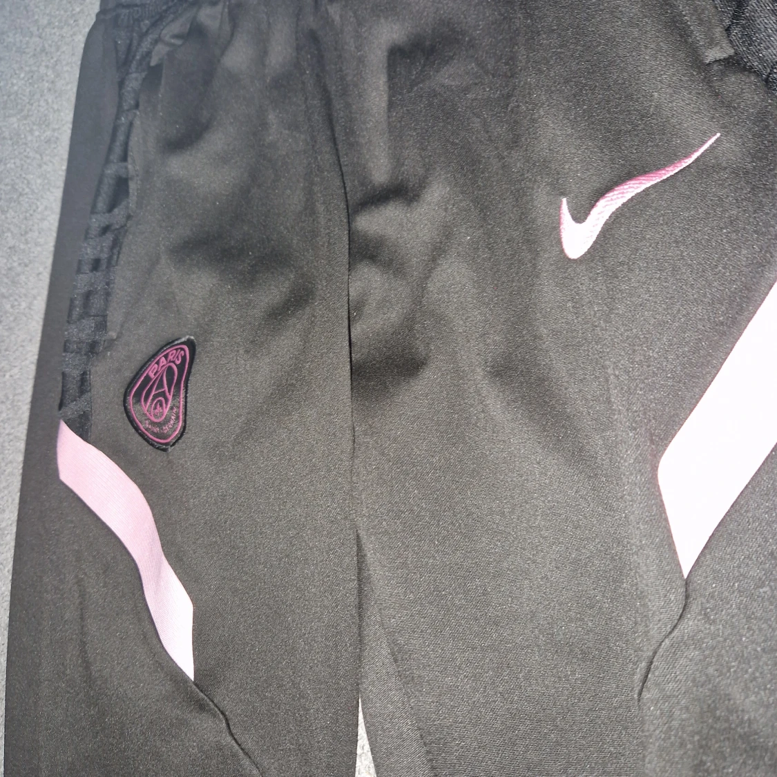 Snygga svarta träningsbyxor från Nike med rosa detaljer och PSG-logga. Perfekta för sport och träning med en bekväm passform och elastisk midja.