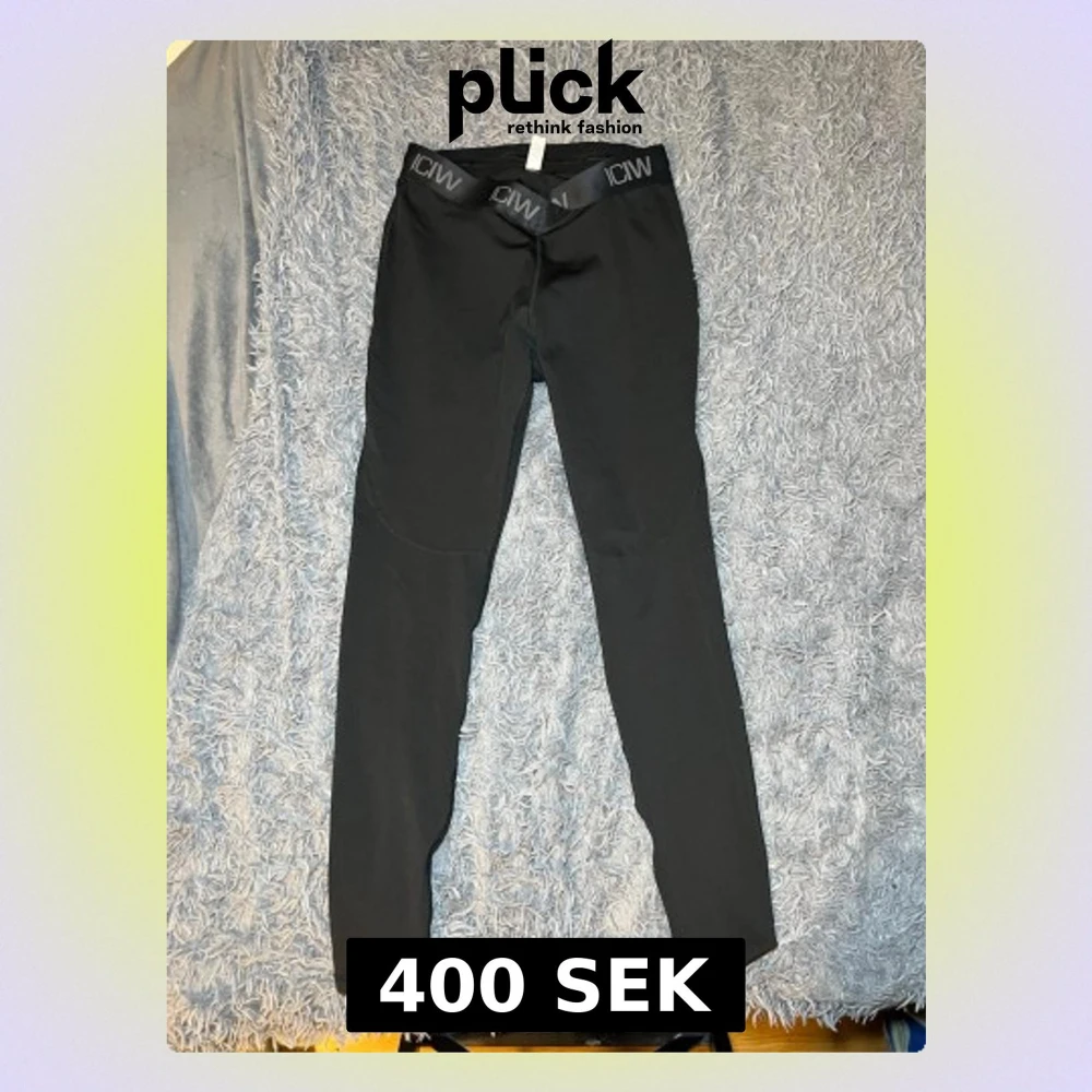 Säljer ett par svarta leggings från ICANIWILL med bred elastisk midja och logga. Materialet är stretchigt med 78% återvunnen polyester och 22% spandex, vilket gör dem riktigt sköna och följsamma. Perfekta för träning eller chill. silikonremsor på insidan av midjan för extra grepp. Nypris 799kr