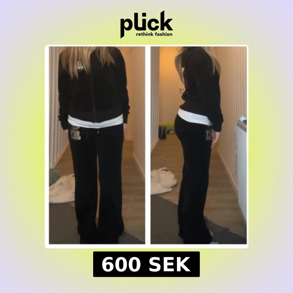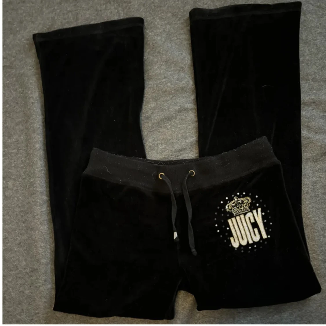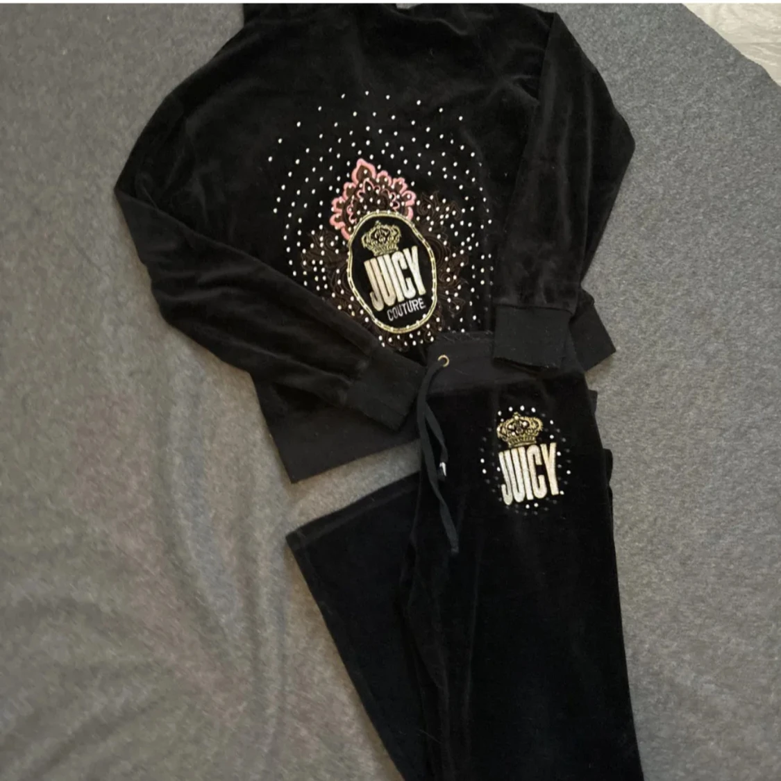 Säljer ett par svarta vintage set från Juicy Couture med glittrig logga på benet. Det står xl på ettiketten men skulle säga att den är S, det har även lossnat ganska många stenar tyvärr :((