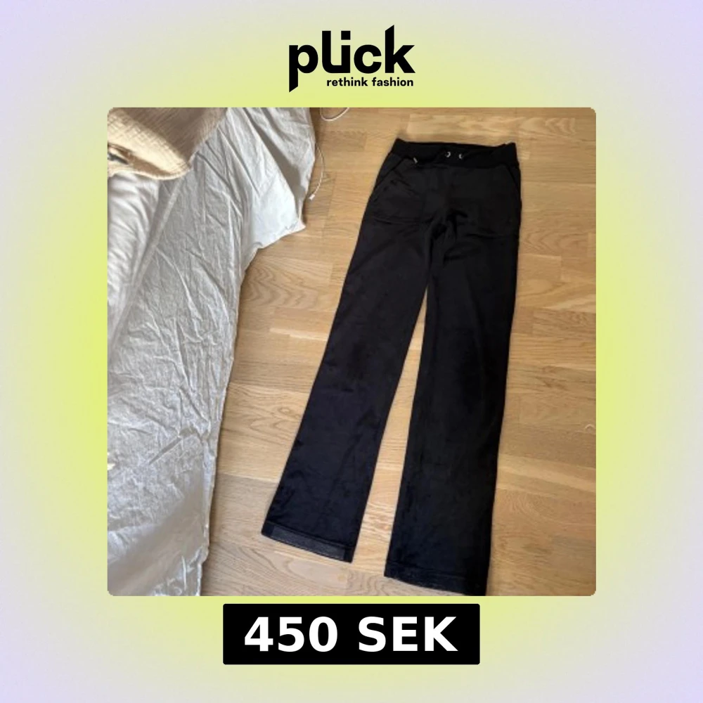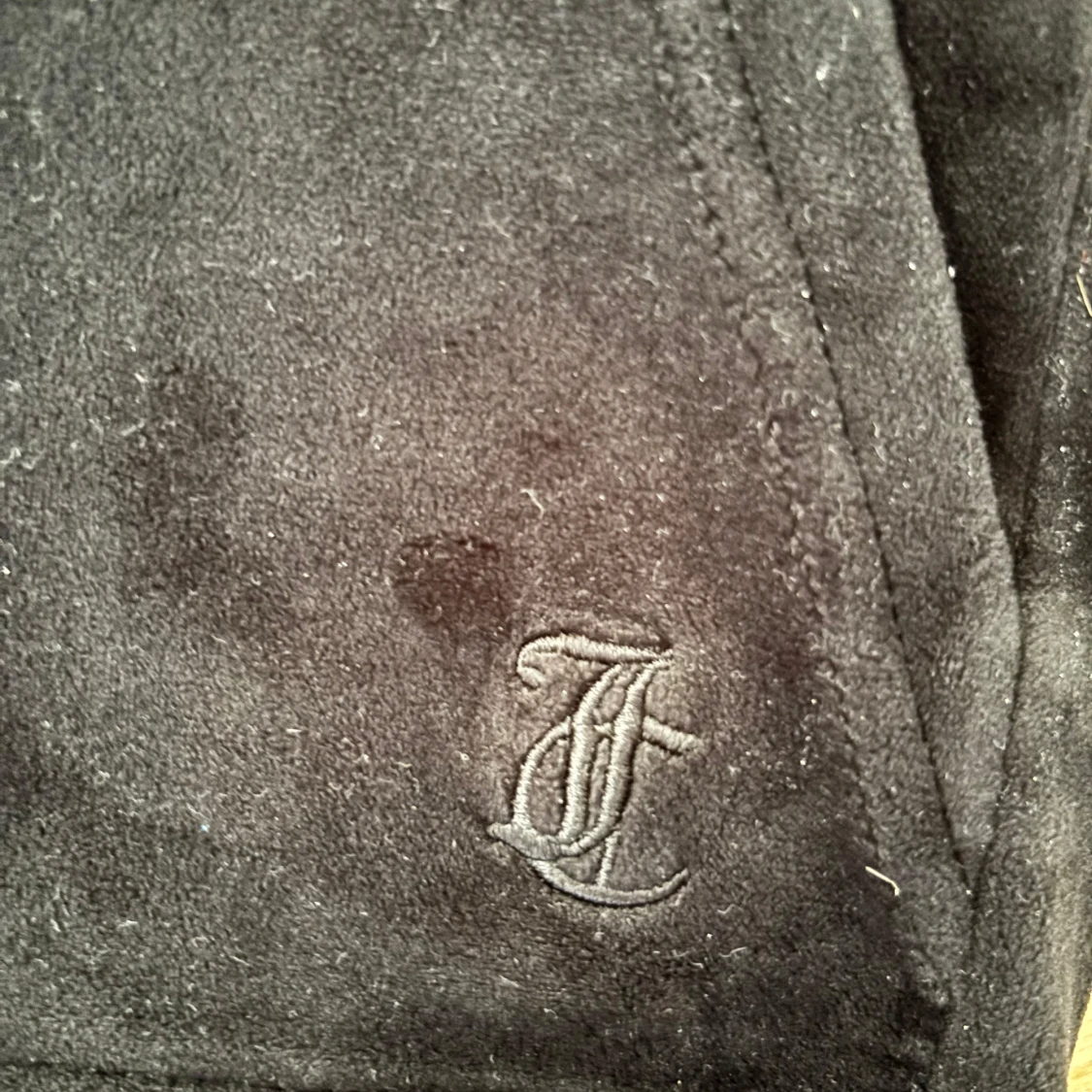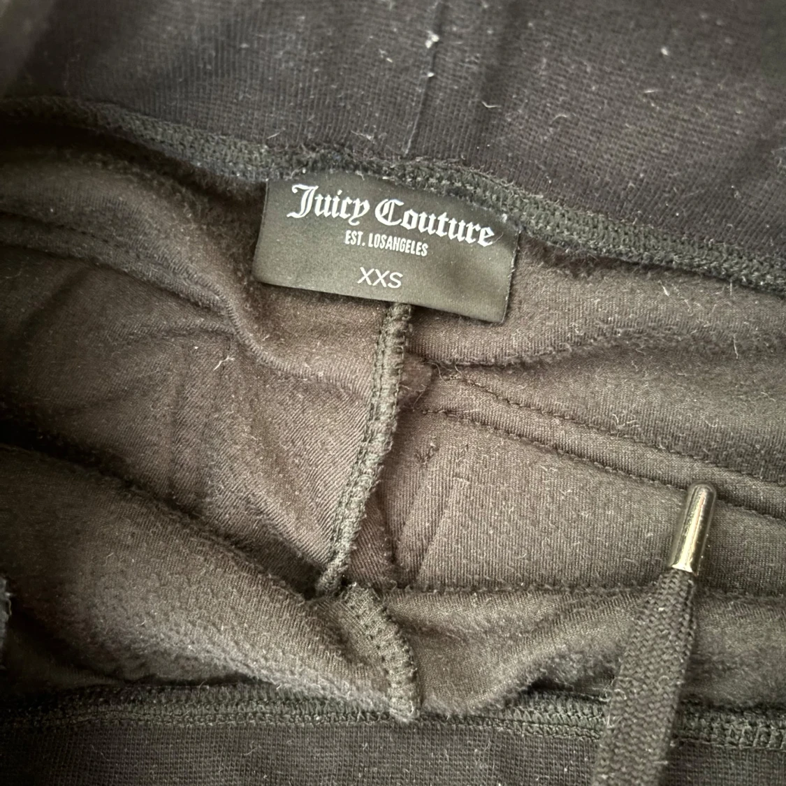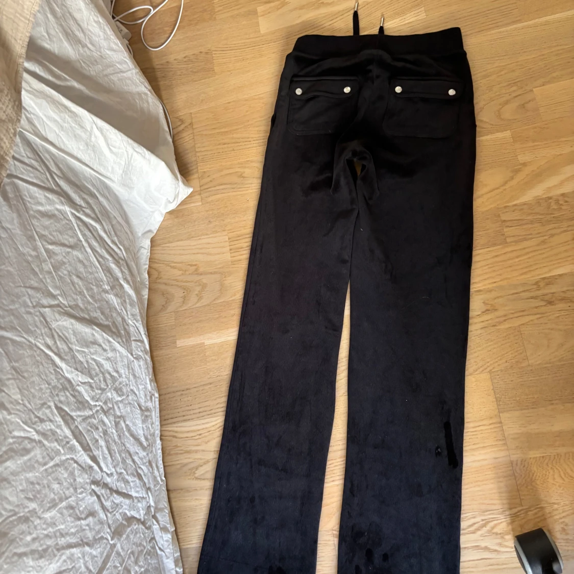 Svarta mjukisbyxor från Juicy Couture i velour med broderad JC-logga framtill. Byxorna har snörning i midjan, raka ben och fickor både fram och bak med silvriga knappar. Perfekta för en chill och trendig look. Har follat upp byxorna innan och sedan har follen lossnat, men den är enkel att få bort