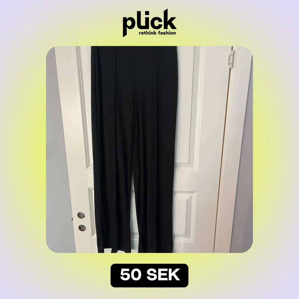 Säljer ett par svarta vida byxor i mjukt material. De är högmidjade och perfekta för både vardag och fest. Byxorna har en elegant och stilren design som passar till alla tillfällen. Superbekväma och lätta att matcha med olika toppar!