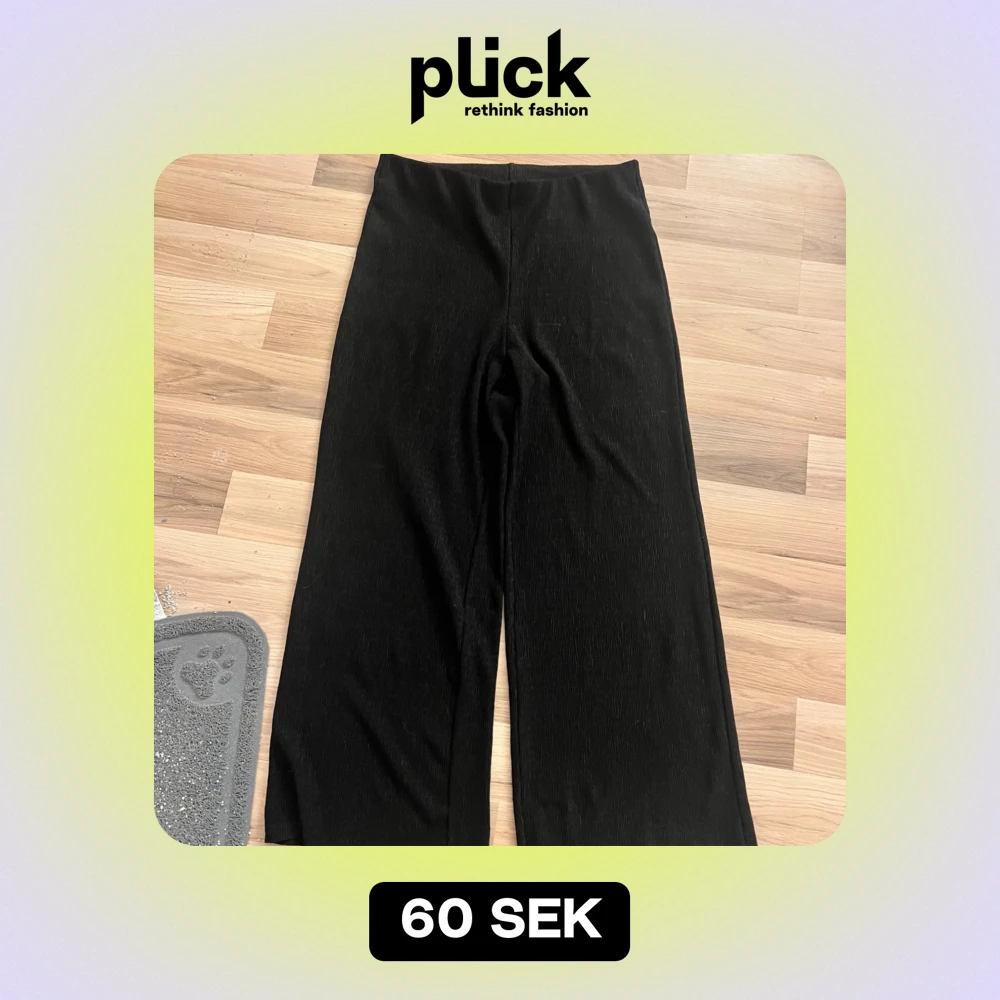Säljer ett par svarta vida byxor i ribbat material. De är högmidjade och har en loose passform, perfekt för både vardag och fest. Byxorna är i mycket bra skick och superbekväma att ha på sig. Passar perfekt till höst och vinter! 🖤