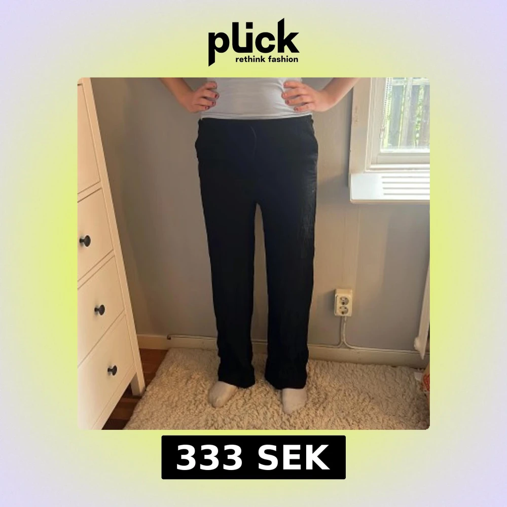 Svarta byxor från H&M med tunn resår i midjan och avslappnad passform. Byxorna är vida i benen och har en lätt ribbad struktur i tyget. Det är linnebyxor.