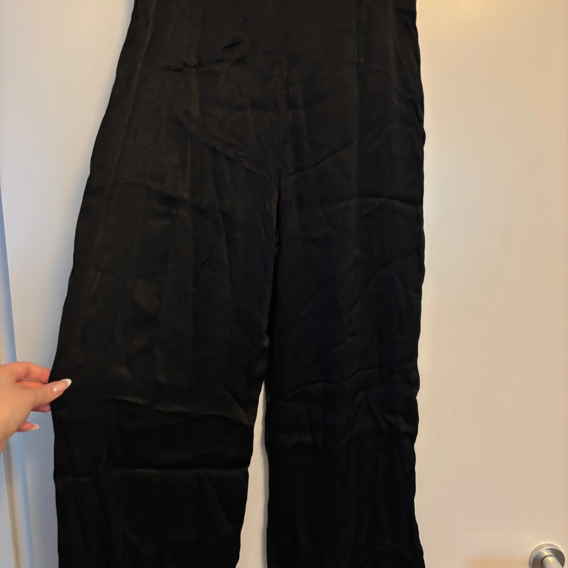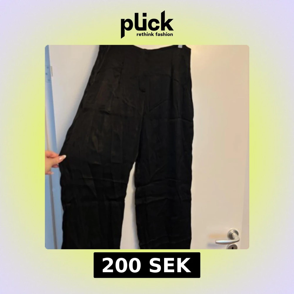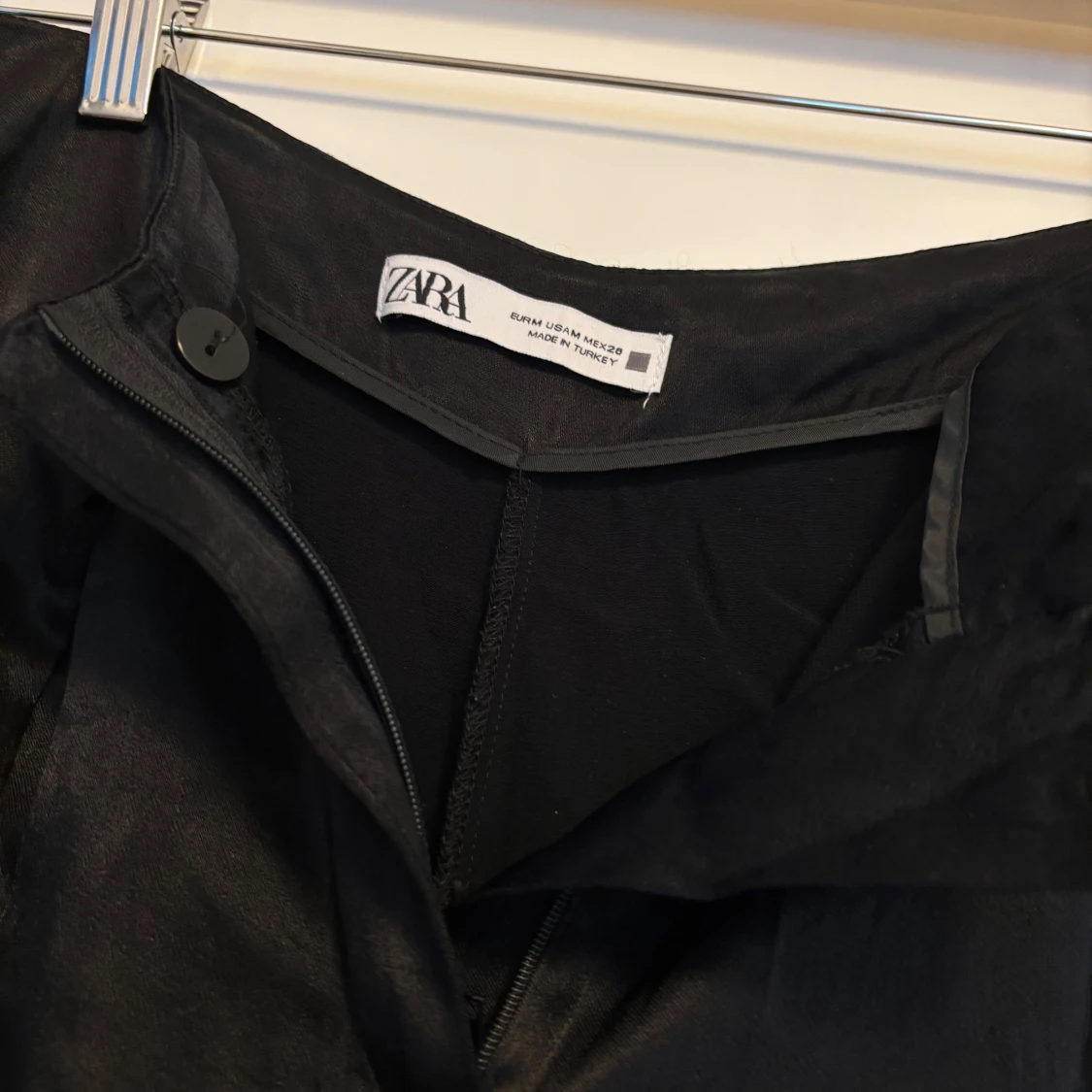 Snygga svarta byxor från Zara med hög midja och vida ben. Byxorna har en lätt glansig finish och stängs med dragkedja och knapp framtill. Perfekta för en stilren look och passar till många olika outfits.