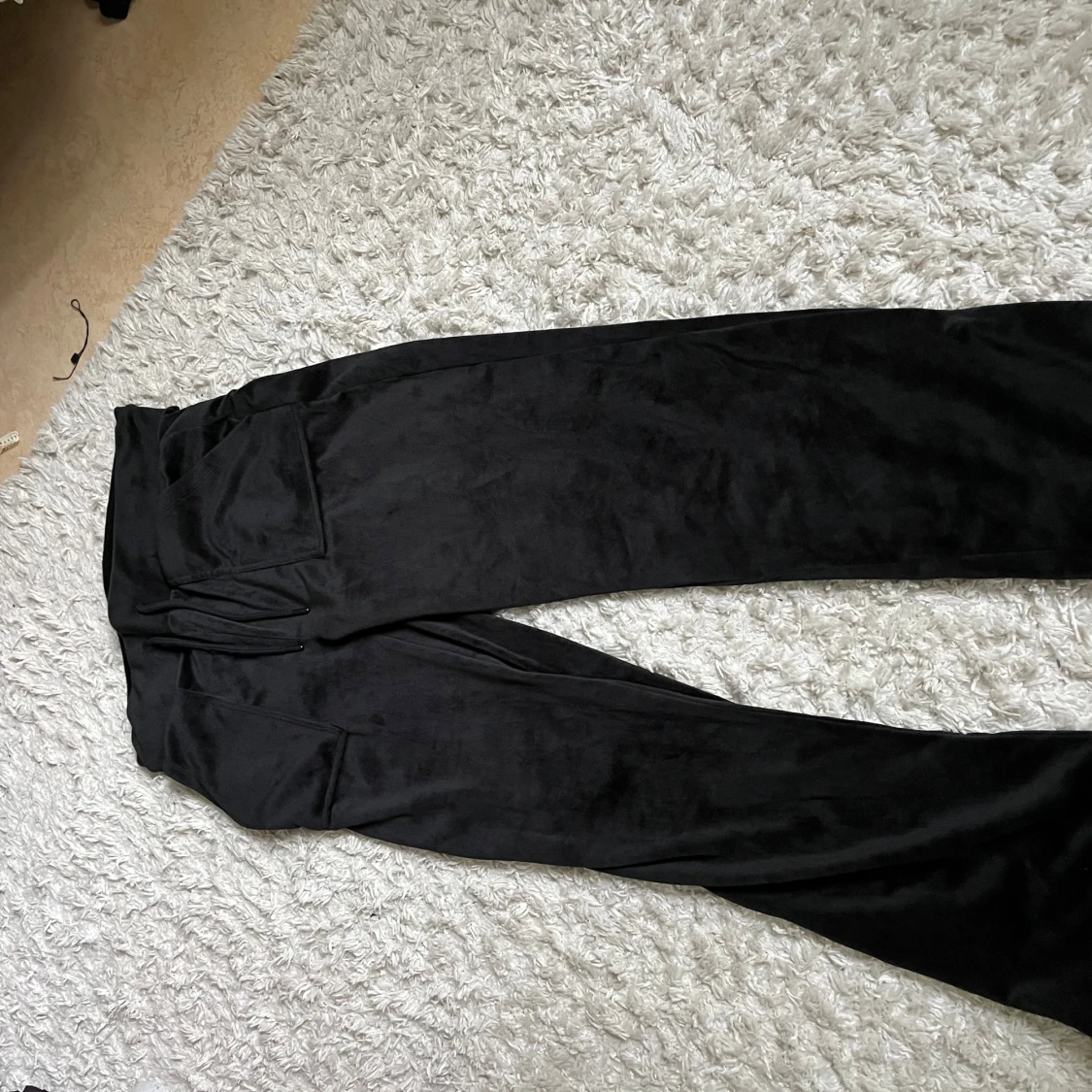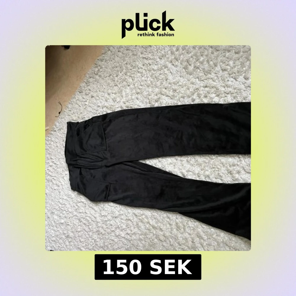 Säljer ett par svarta byxor i mjuk sammet med vida ben och hög midja. Byxorna har stora fickor framtill och en snygg, avslappnad passform. Perfekta för dig som gillar en trendig och bekväm stil.