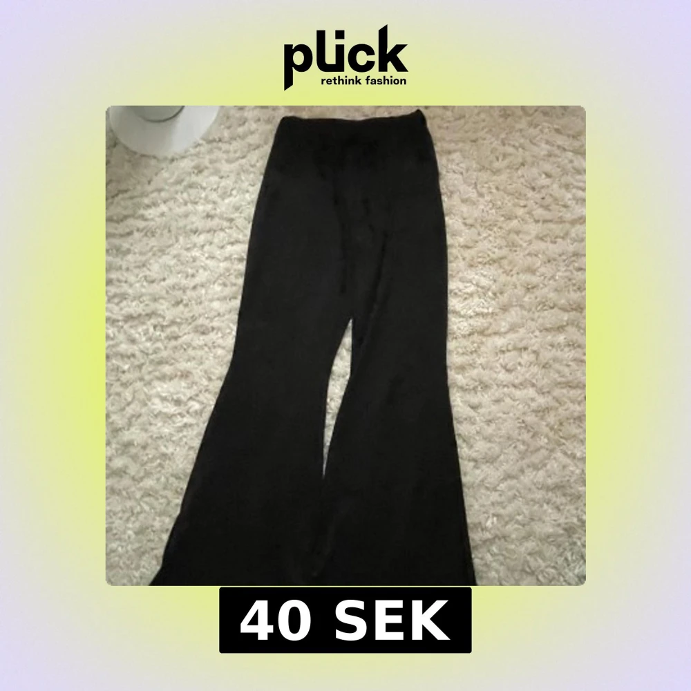 Säljer ett par svarta byxor med snyggt fall och breda ben. De har en hög midja och är gjorda i ett glansigt material som ger en lyxig satinlook. Perfekta om du vill sticka ut lite extra med en trendig och bekväm stil. Har ett litet hål på knäet men det syns knappt