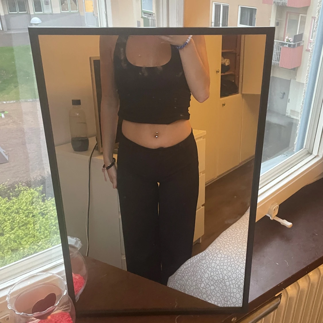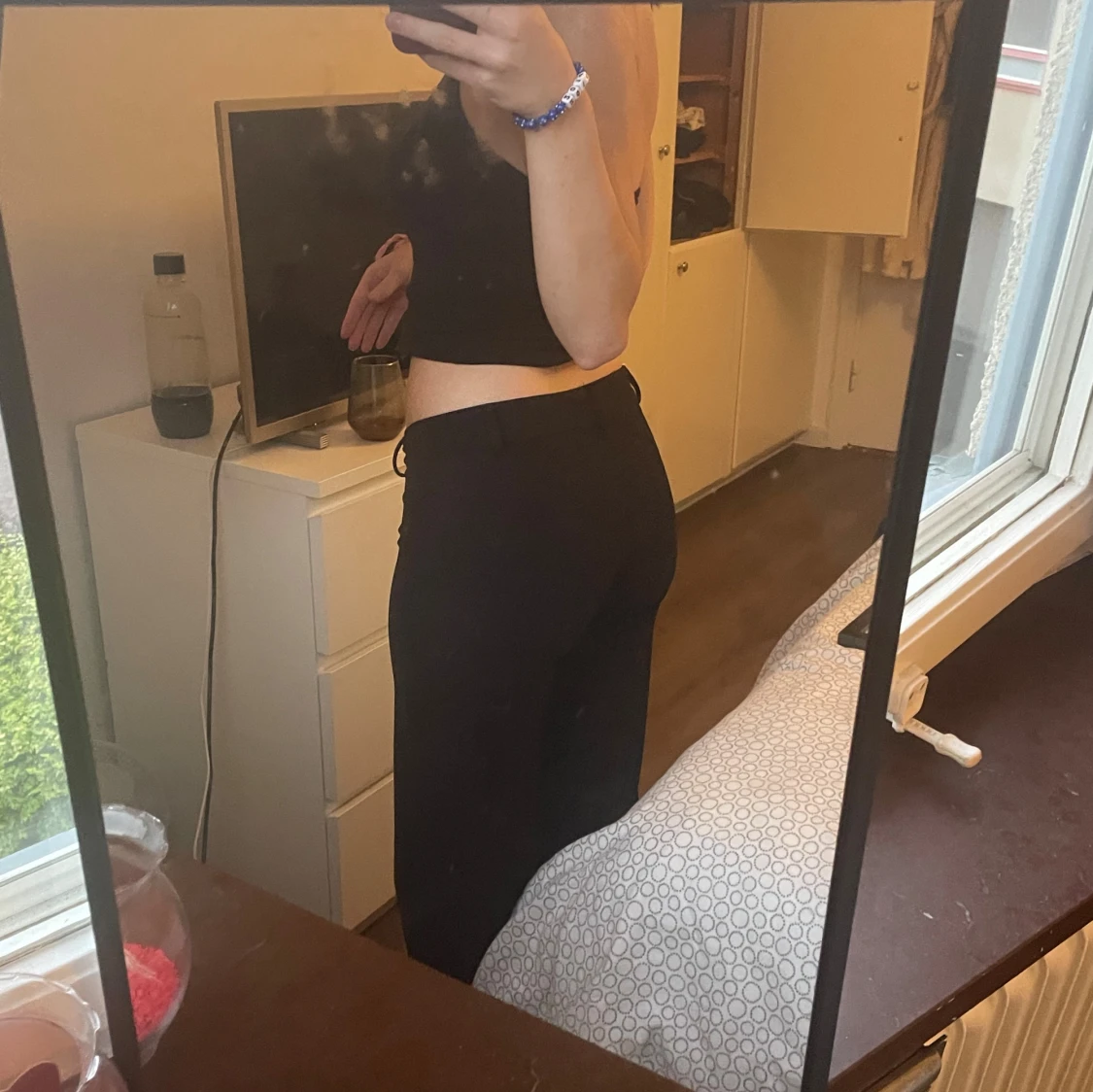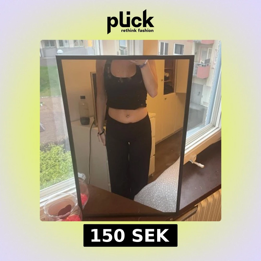 Säljer ett par svarta kostymbyxor med raka, vida ben. Materialet är mjukt och stretchigt, vilket gör dem riktigt bekväma att ha på sig. 💞💞🌸