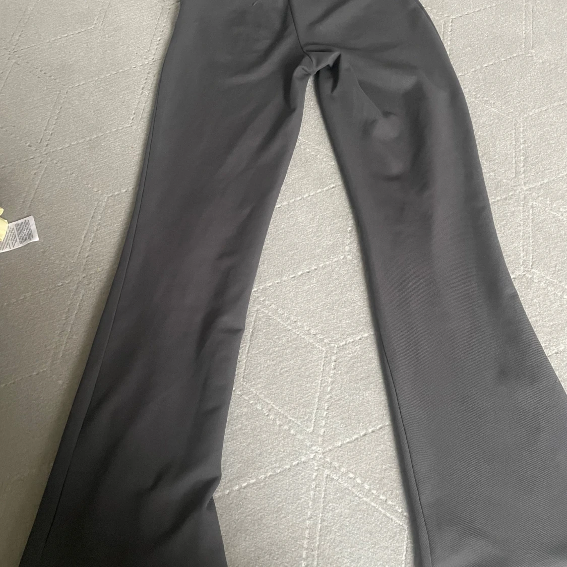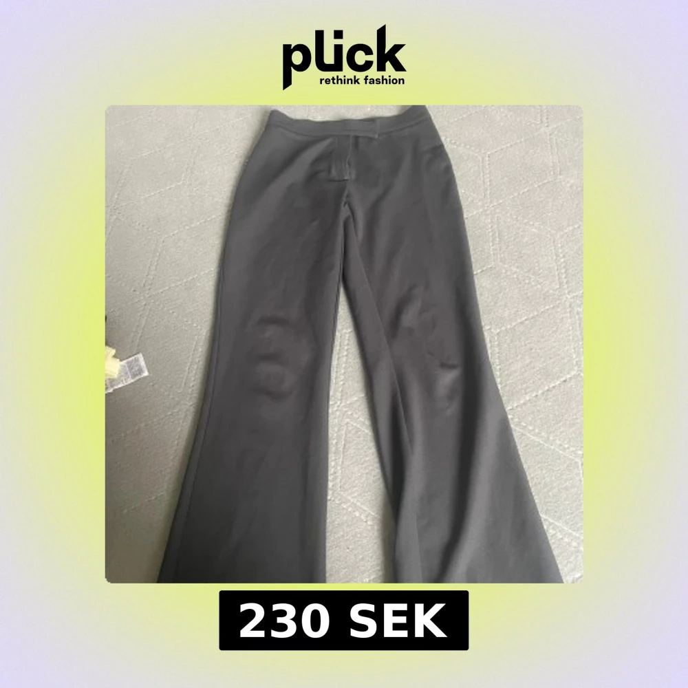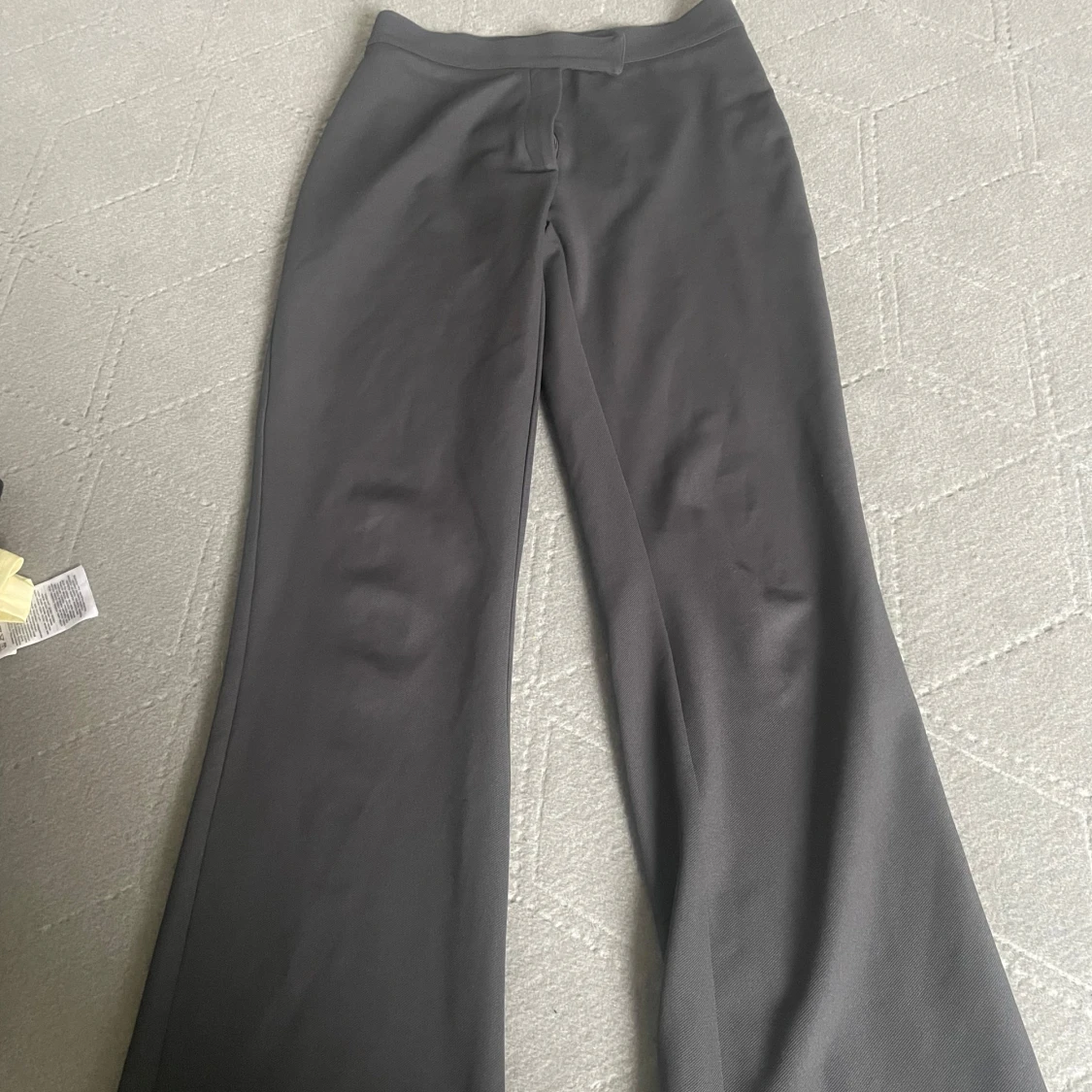 Snygga mörkgrå kostymbyxor med vida ben och klassisk passform. Byxorna har hög midja och är i storlek xs men passar mig som har s.Bra till tjejer som är lite längre