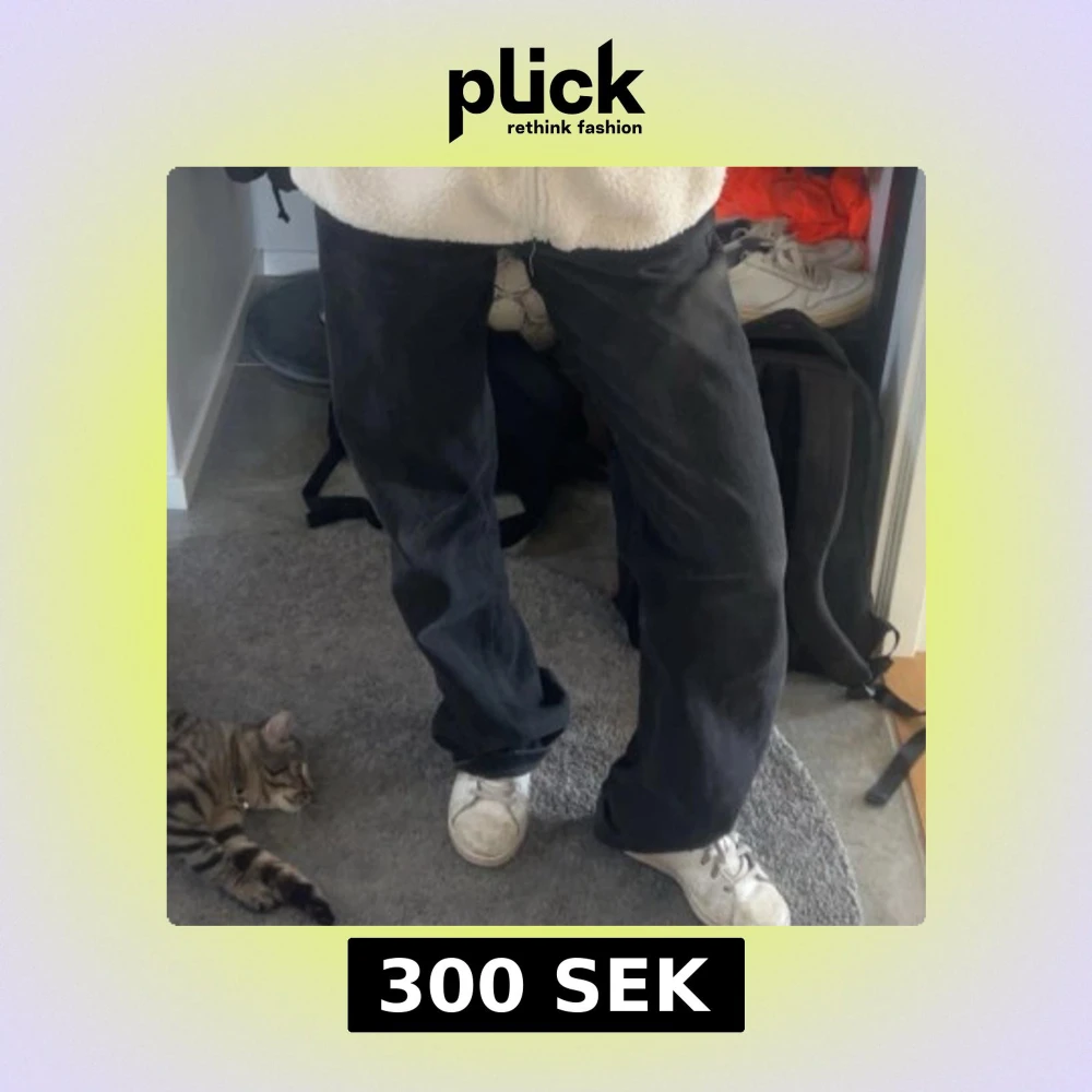 Säljer ett par svarta jeans med rak och lite vidare passform. Klassisk femficksmodell med knapp och dragkedja framtill. Jeansen är i ett mjukt denimtyg och har en avslappnad vibe, längst ner på byxorna är dom lite slitna pga att dom är för långa för mig och släpas lite halvt på marken