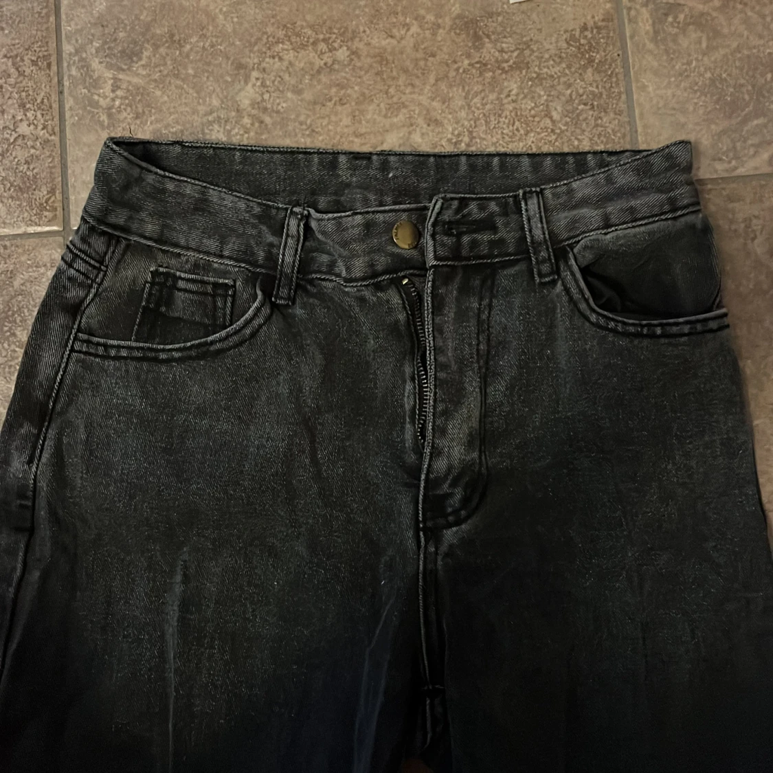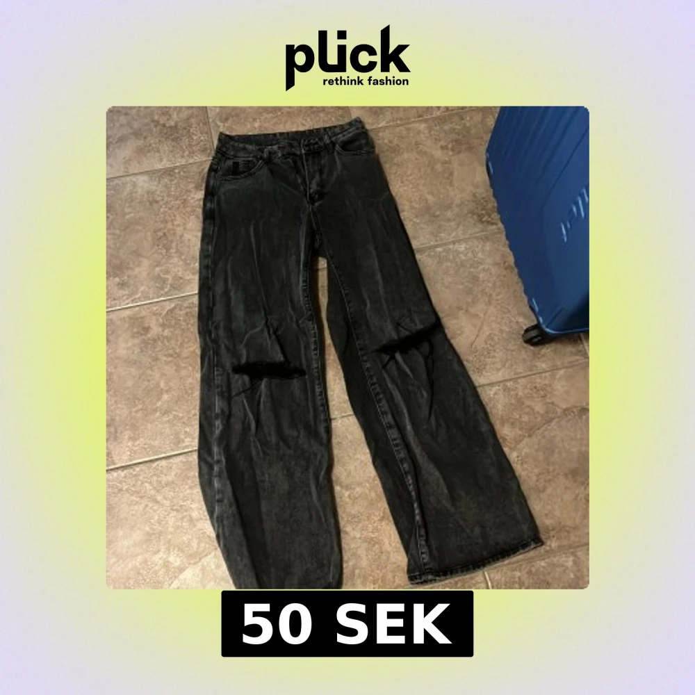 Säljer ett par svarta jeans med breda ben och slitna hål över båda knäna. Jeansen har klassisk femficksdesign, dragkedja och knapp framtill. Snygg tvättad look som ger en cool vibe.