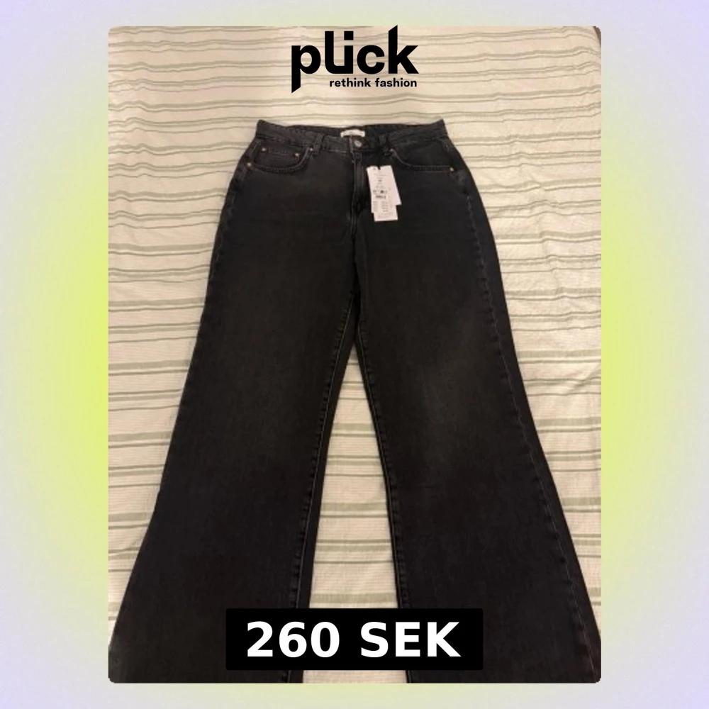Säljer ett par svarta wide jeans från Gina tricot i storlek 40. Byxorna har hög midja, klassisk femficksdesign och raka, vida ben. Materialet är jeans i bomull och de har en snygg mörk tvätt. Perfekta till sneakers eller boots.