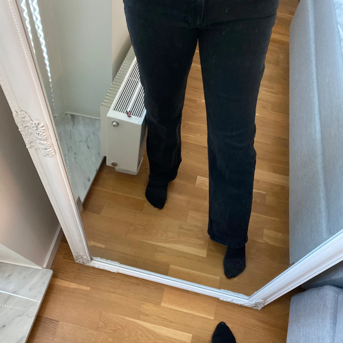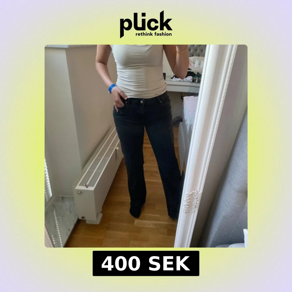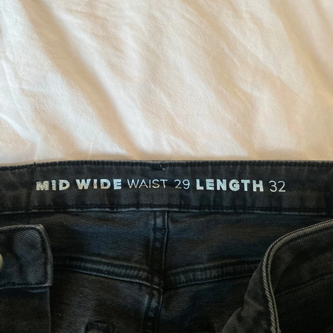 Säljer ett par svarta jeans med midwaist och wide fit. De har klassisk femficksdesign och raka, vida ben. Perfekta om du gillar en avslappnad men ändå snygg look. Storlek 29 i midja och 32 i längd.