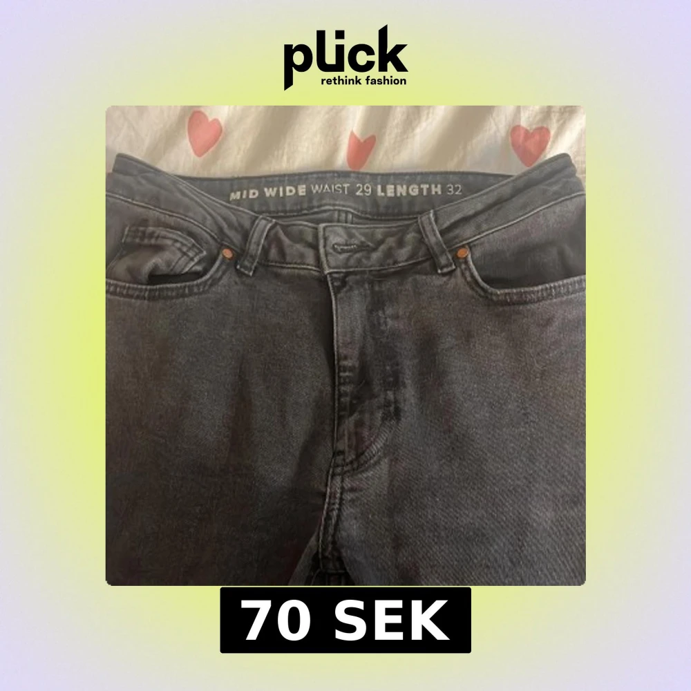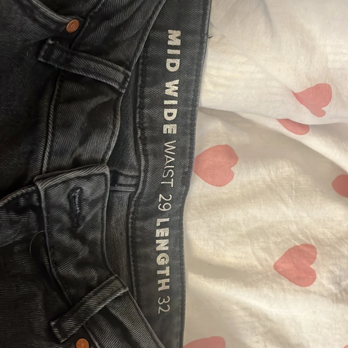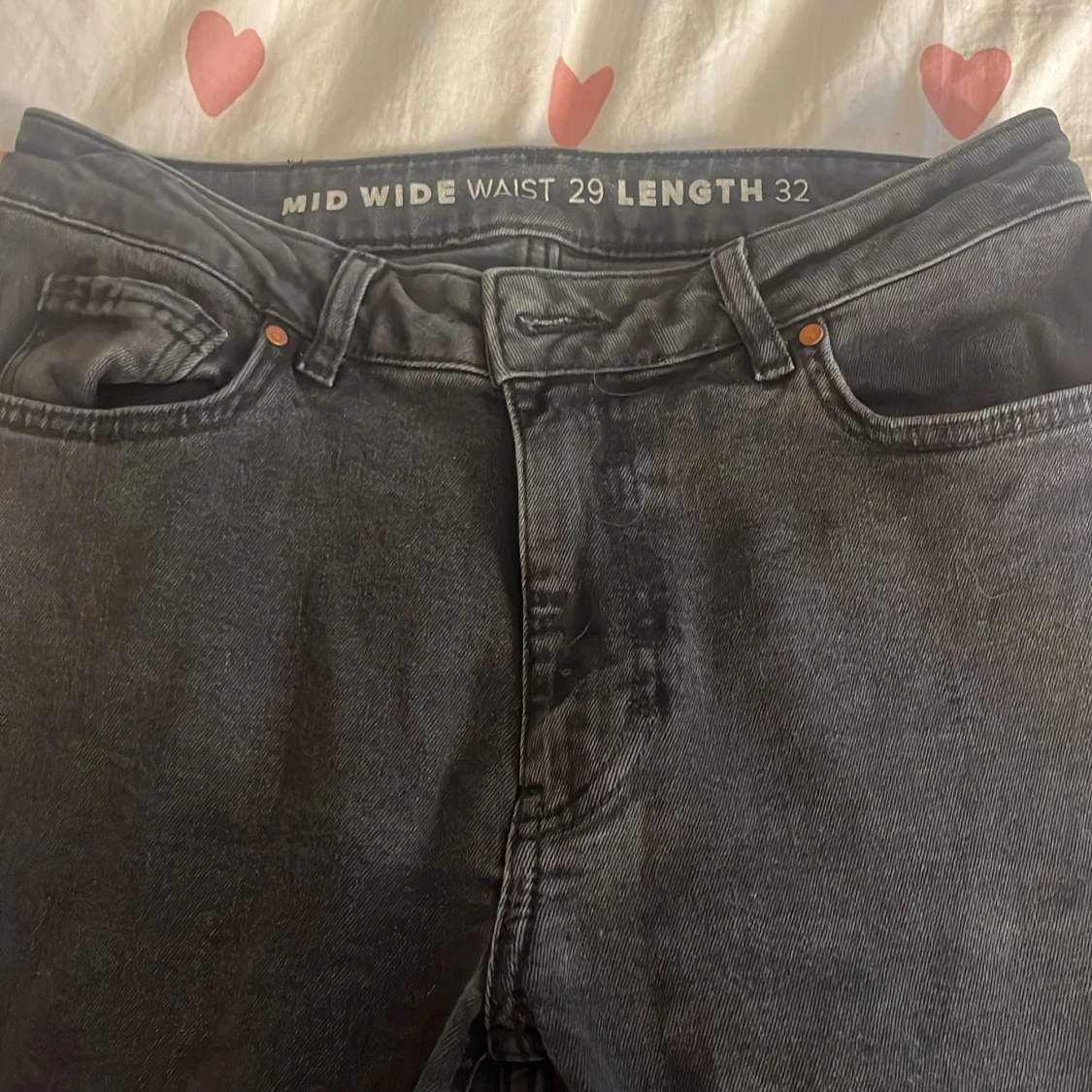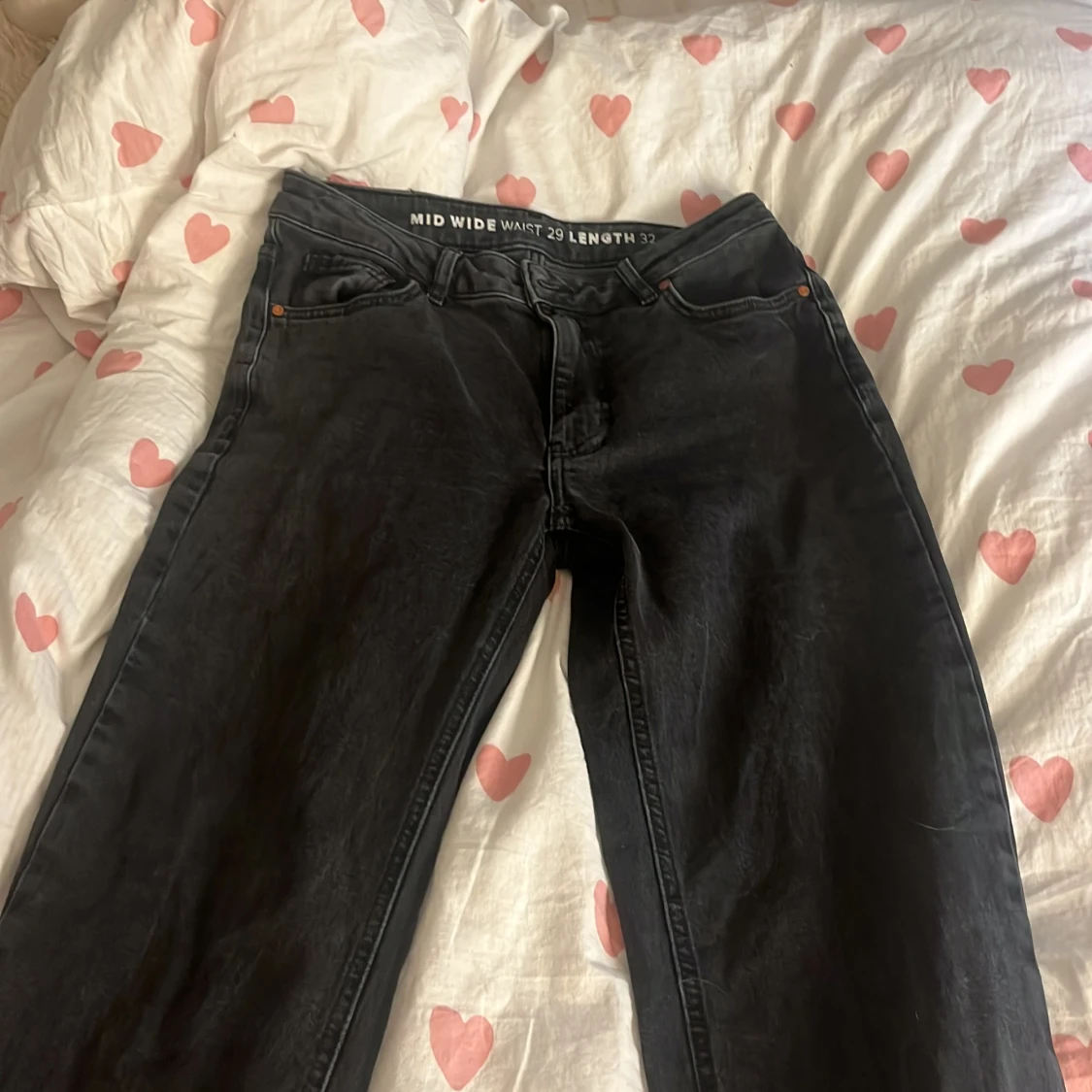 Säljer ett par svarta jeans med midwaist och wide fit. Klassisk femficksmodell med dragkedja och knapp. Snygg tvättad svart färg och raka, breda ben som ger en chill vibe. Perfekta till sneakers eller boots. Ca strl M