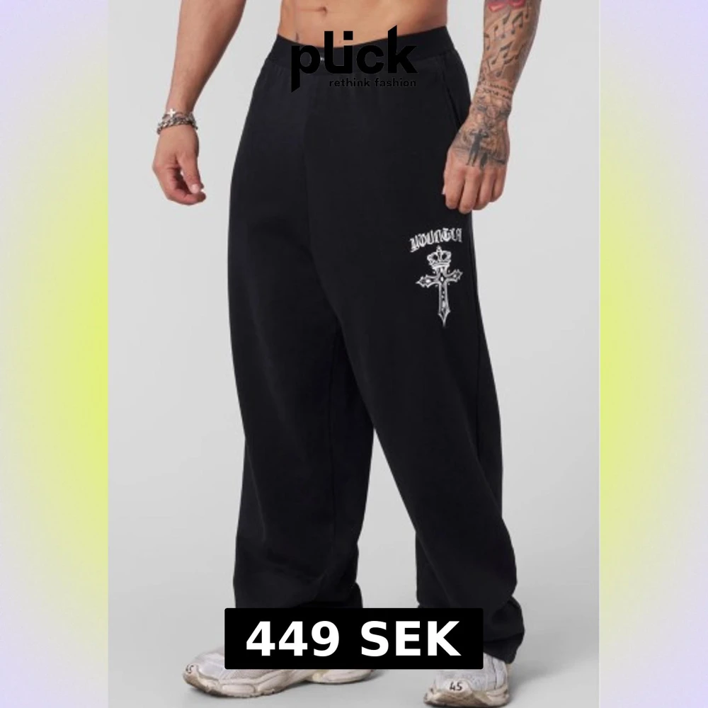 Svarta mjukisbyxor från YoungLA med bred passform och tryck med kors och text på ena benet. Resår i midjan för skön komfort. Perfekta för en avslappnad streetwear-look.