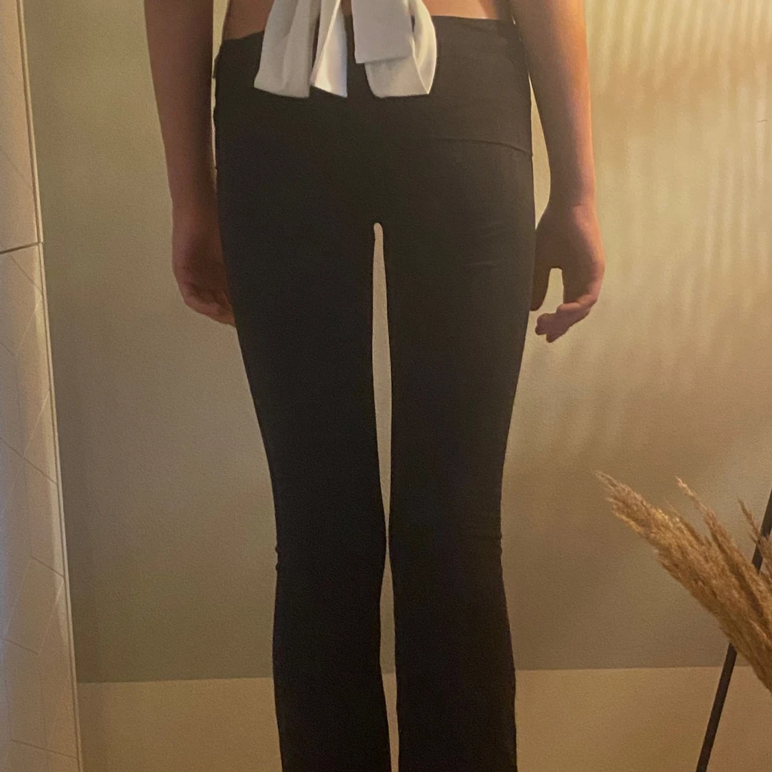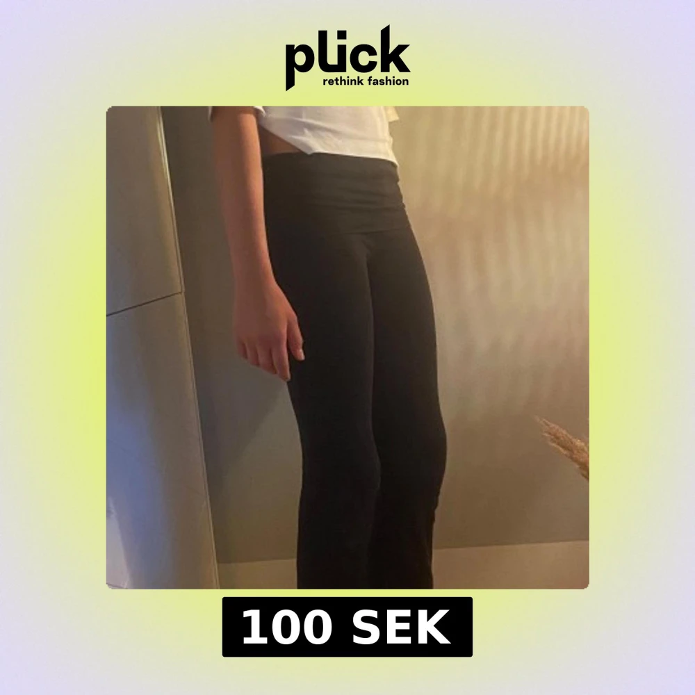 Säljer ett par svarta yogapants med bootcut-snitt och låg midja. De är stretchiga och sitter tight över låren men blir vidare nedtill. Perfekta om du gillar en clean och enkel look med lite 90-talsvibe. Passar dig som vill ha bekväma och snygga byxor till vardags.