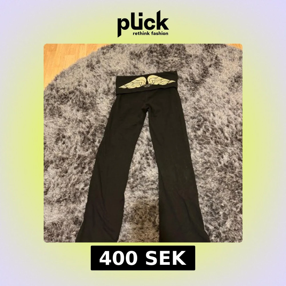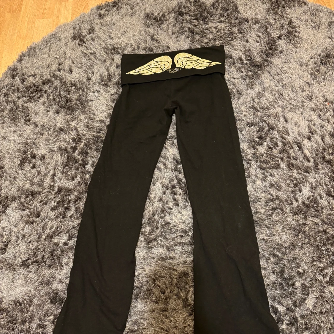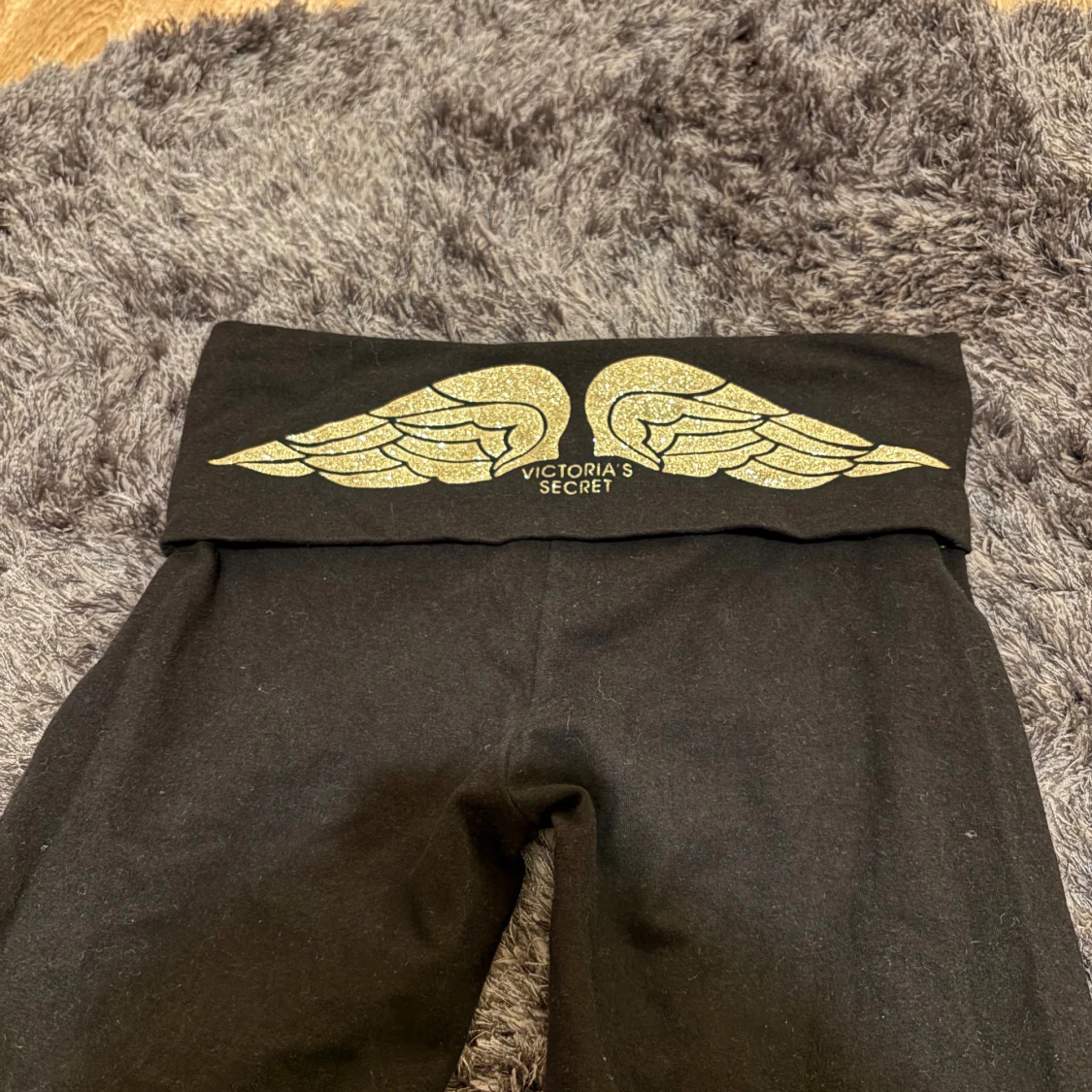 Svarta yogapants från Victoria's Secret med guldglittrande vingar och logga på den vikbara midjan. Byxorna har en tight passform upptill och lätt utsvängda ben. Mjukt bomullsmaterial som är skönt mot huden. 💗