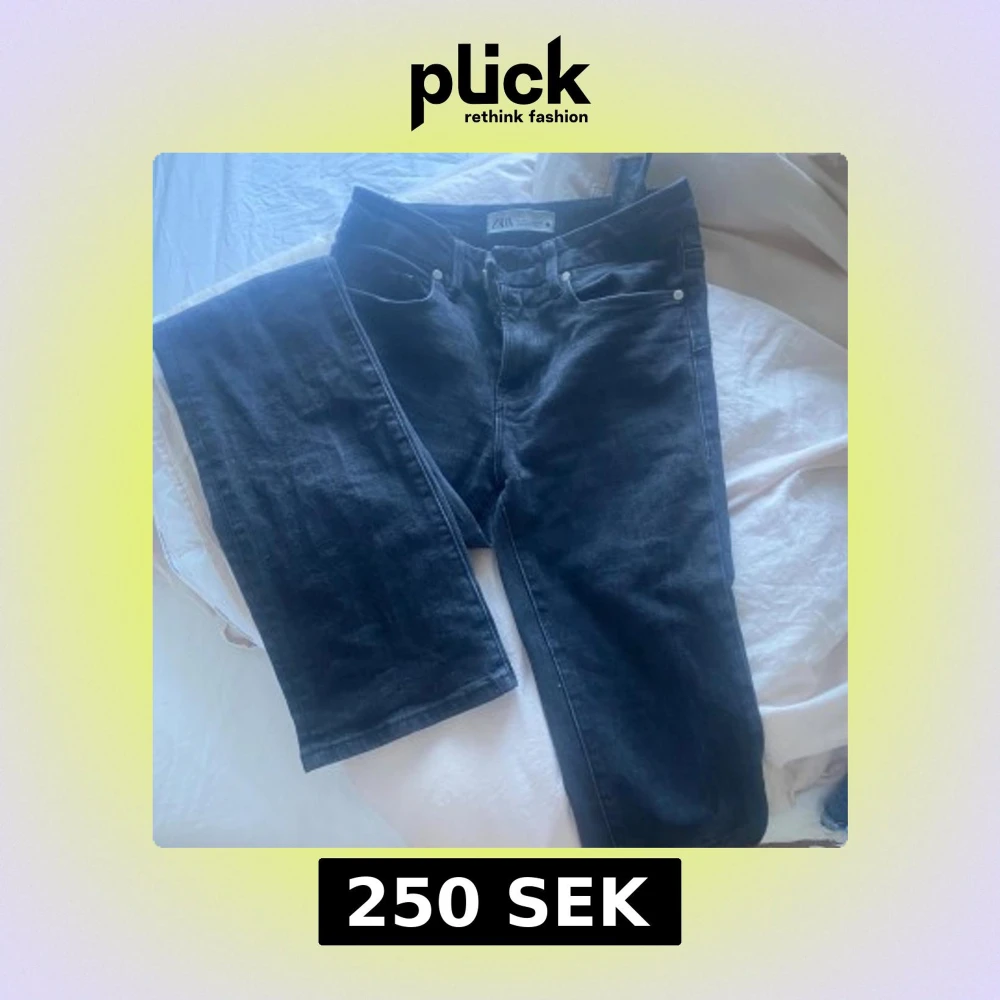 Säljer ett par svarta jeans från Zara i storlek 34. Jeansen är lite utsvängda längst ner. De är använda vilket man kan se vid låren men det ör inget man tänker på när man använder dem.