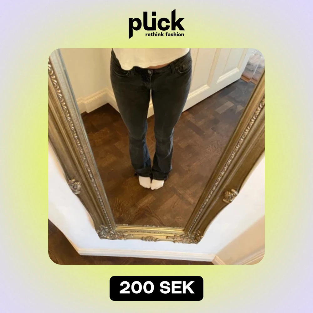 Svarta lågmidjade outwasht jeans. Innerbenslängden: ca 78 cm. Modell: FLAME Välanvända och slitna men fortfarande snygga.