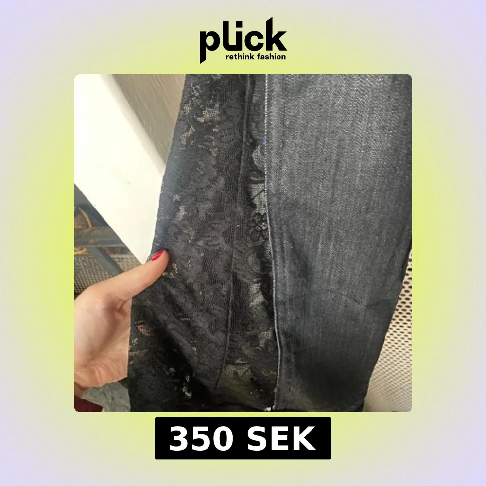 YTTERLIGARE INFO FINNS PÅ BILDERNA! Coola mörkblå jeans med svart spets bootcut och förlängning med samma design! Jeansen var skinny från början och behövdes därav göras om till bootcut💙De har även en liten design på fickan! Benen har en innerbenslängd på ca 90 cm och vi skulle säga att jeansen är ungefär storlek S men läs måtten för att få en bättre bild av hur jeansen passar dig! Bild på mått finns om ni bläddrar vid bilderna!