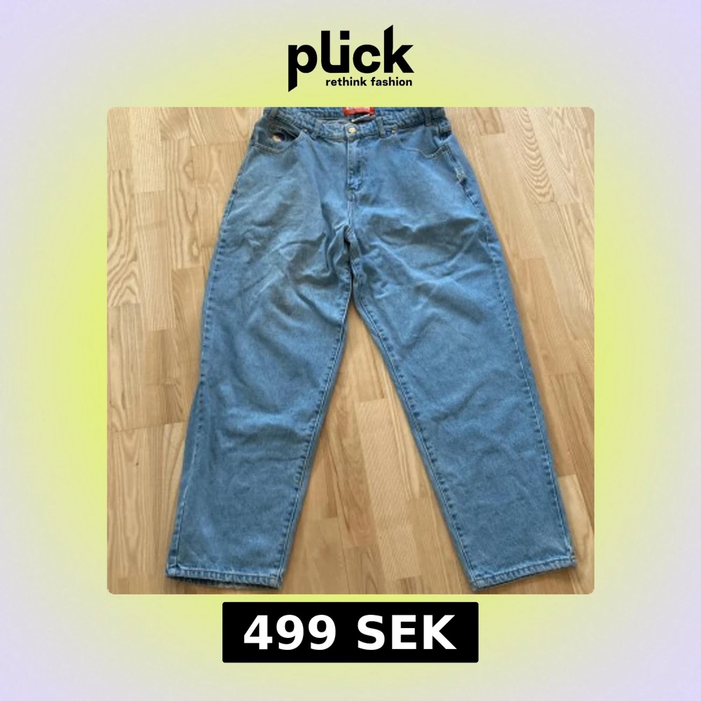 Säljer ett par ljusblå jeansbyxor med en cool broderad detalj vid fickan. Byxorna har en avslappnad passform och är perfekta för en casual look. De har klassiska fem fickor och knappar i midjan.