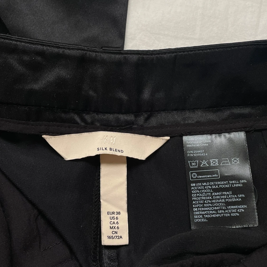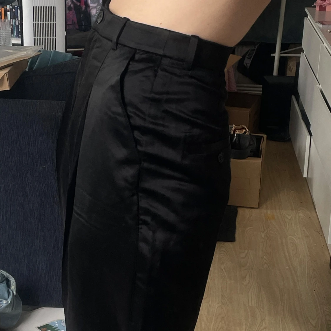 Snygga svarta kostymbyxor från H&Ms Premiumkollektion i sidenblandning. Byxorna har hög midja, raka ben och en glansig finish som ger en lyxig känsla. Klassisk passform med hällor för bälte och fickor i sidorna. Tyvärr aldrig använda pga sensory issues. Ganska små i storleken, beroende på midjemått är dom nog 36/38, jag är normalt en 36a.