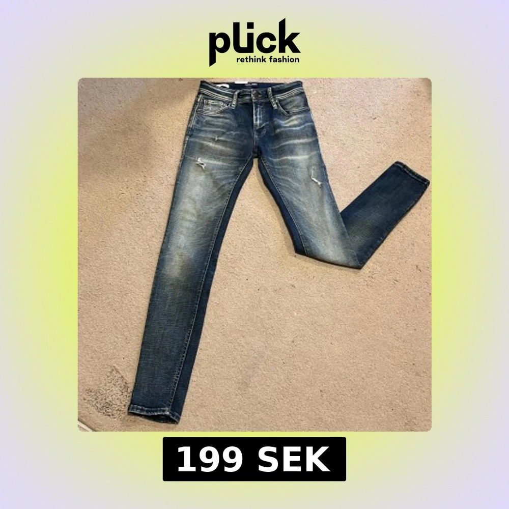 (Helt nya) Säljer ett par blå skinny fit jeans från Jack & Jones, modell Liam. Jeansen har slitna detaljer och klassisk femficksdesign. Perfekta för dig som gillar en tajt passform och en trendig, lite ruff look. 27/l32