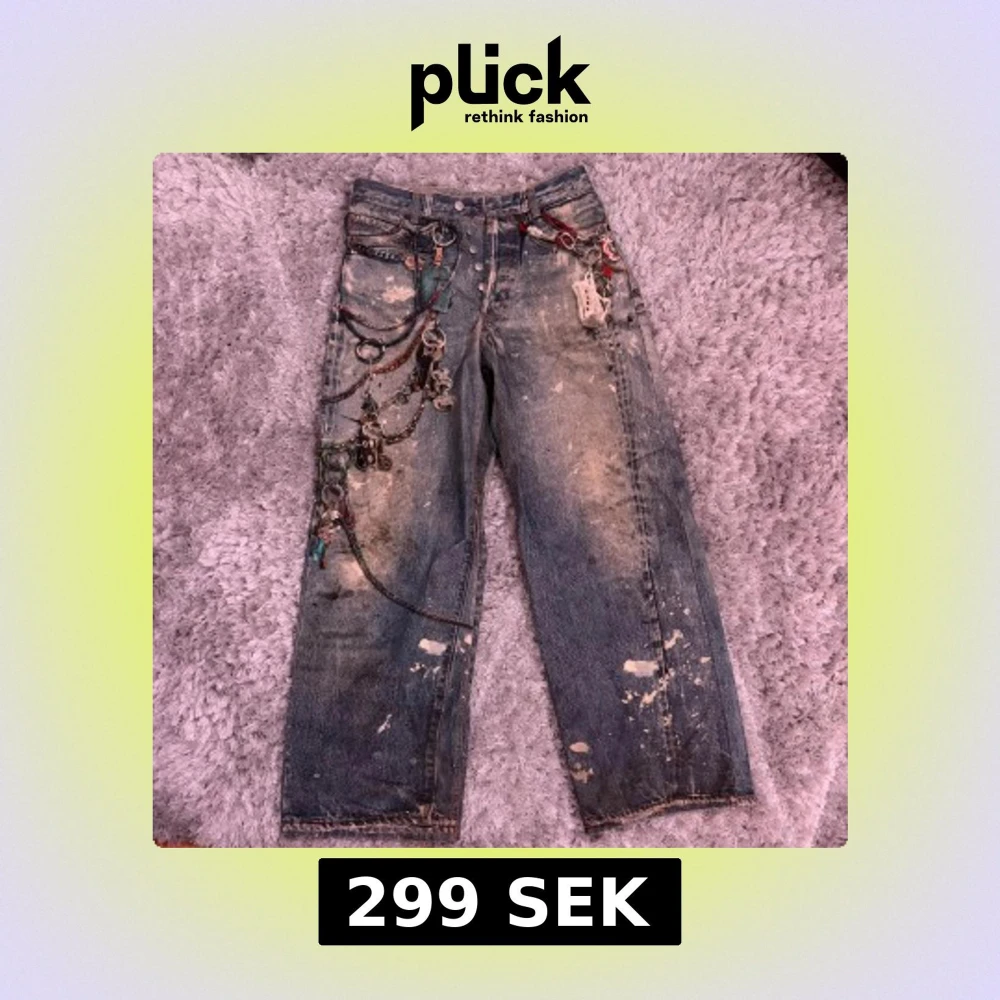 Unika blå jeans från Acne Studios med custom fake tryck detaljer som kedjor, nyckelringar och färgstänk. Raka ben, tapered baggy passform och råa benslut. Jeans i bomull med coola slitningar och grym streetkänsla. Perfekta för dig som vill sticka ut. Väldigt bra skick.