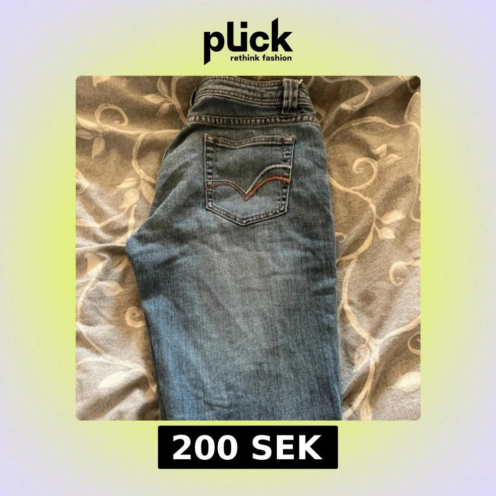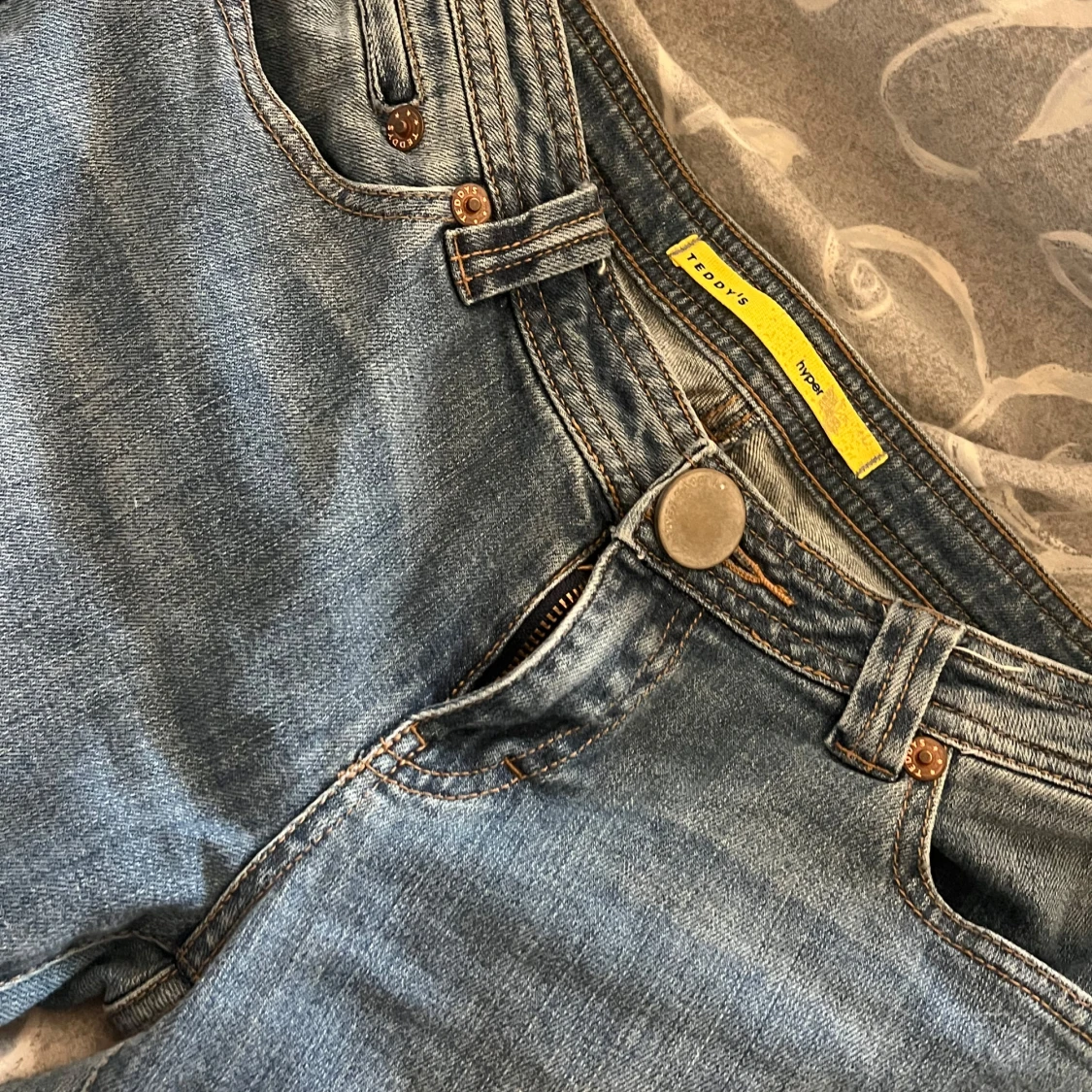 Klassiska blå jeansbyxor från Teddy's Hyper med fem fickor och snygga kontrastsömmar. Bakfickan har dekorativ broderad detalj i vitt och orange. Perfekta för en avslappnad stil. Är från 2010 som nya!