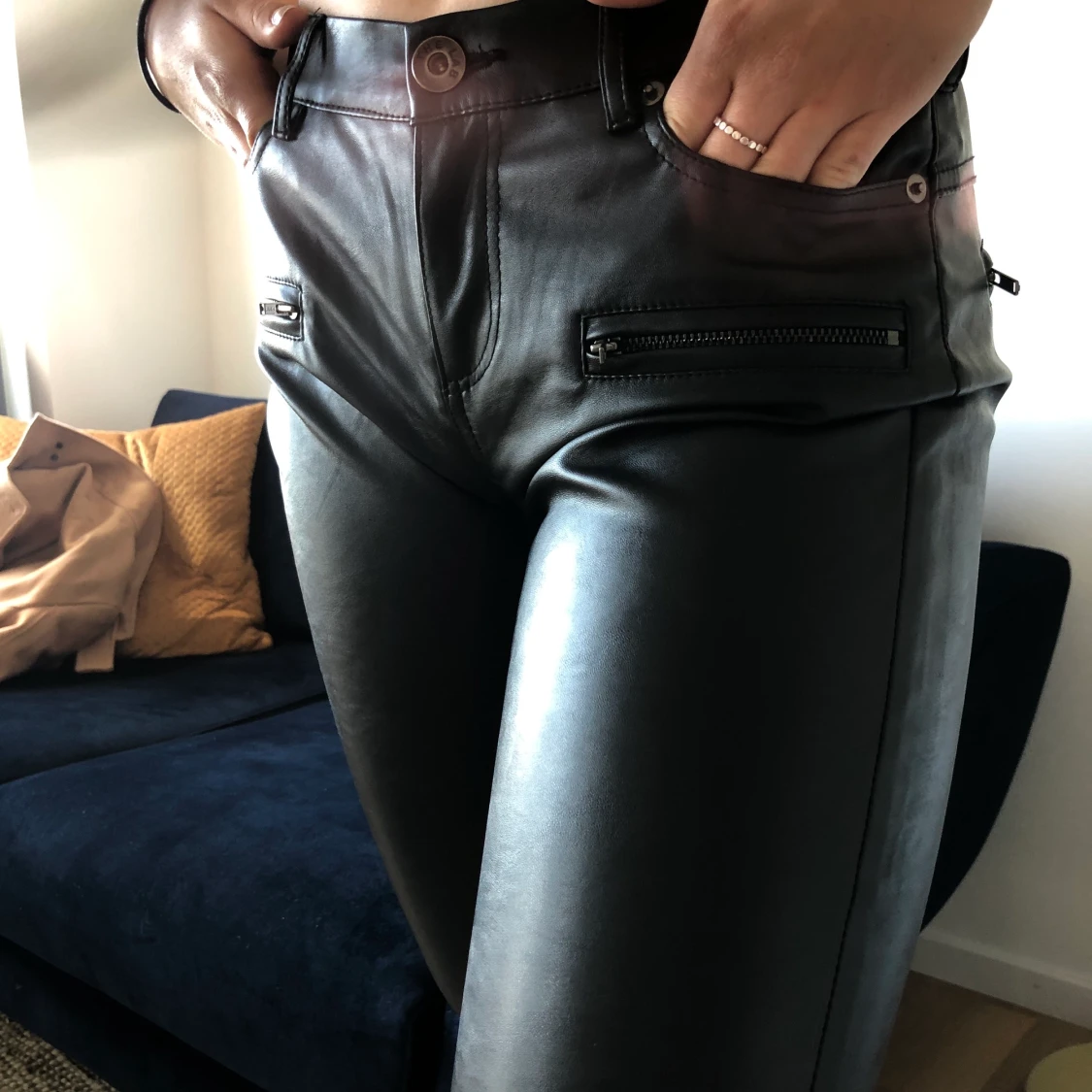 Svarta skinnbyxor i fakeläder från The lab, nypris 2000kr. Sparsamt använda, lite lös i en ögla där bak. Storlek 26. Finns att hämta i Malmö/Lund annars tillkommer frakt