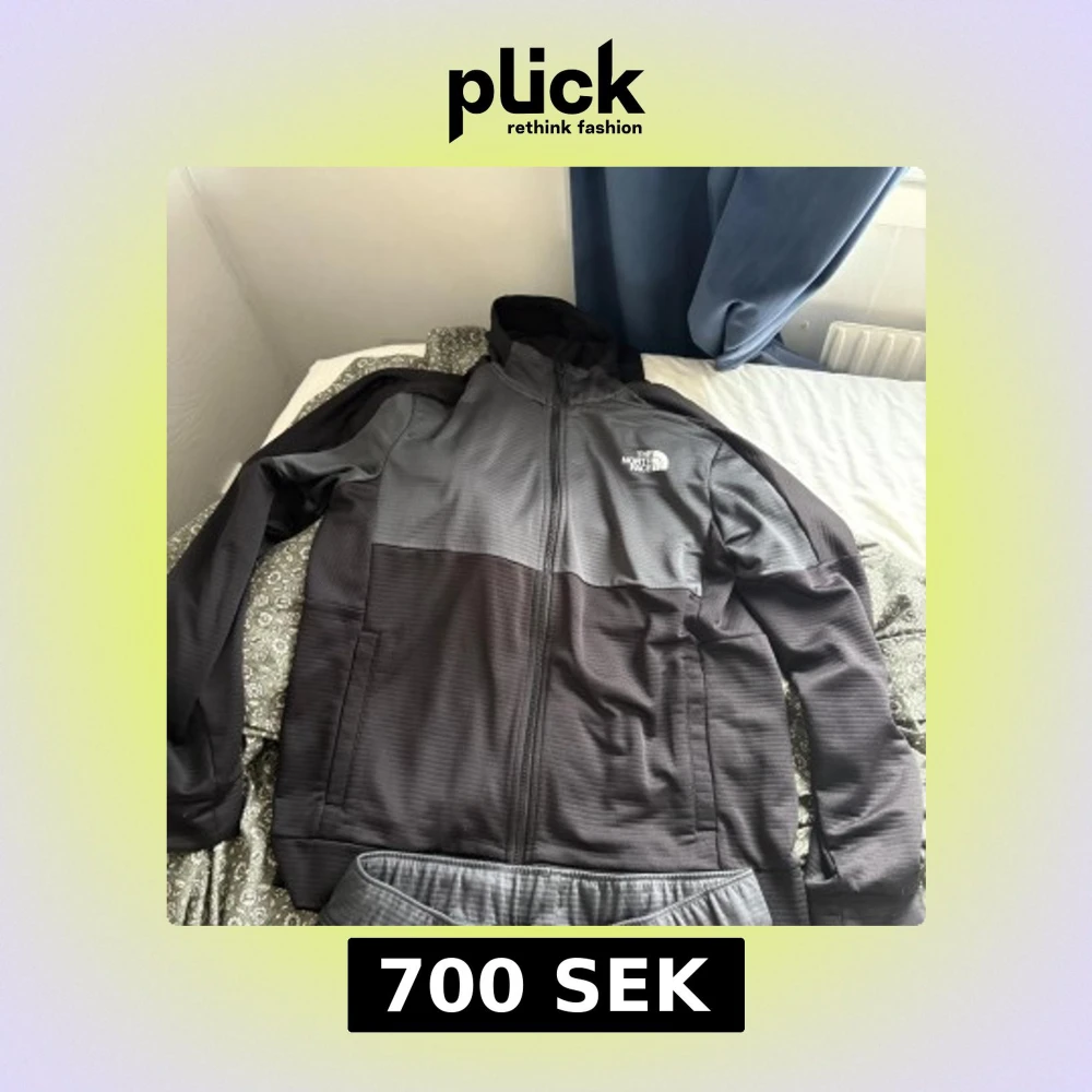 Säljer ett par grå träningsbyxor från The North Face med diskret randig struktur. Byxorna har elastisk midja, raka ben och logga på benet. Perfekta för chill eller träning, tillverkade i mjukt syntetmaterial som andas.Säljer även tröjan med byxorna så de blir ett komplett sett.