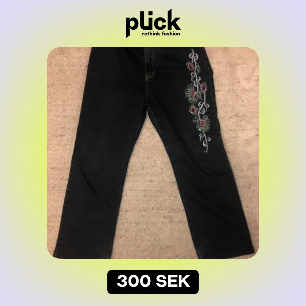 Thrifted jeans good condition no damage. Sewn flowe pattern on roght leg and back right pocket.