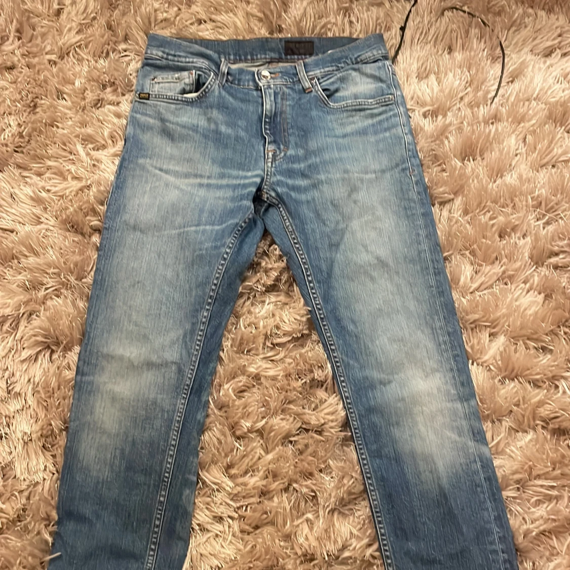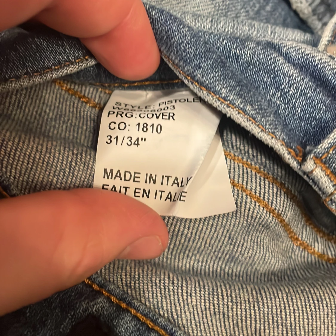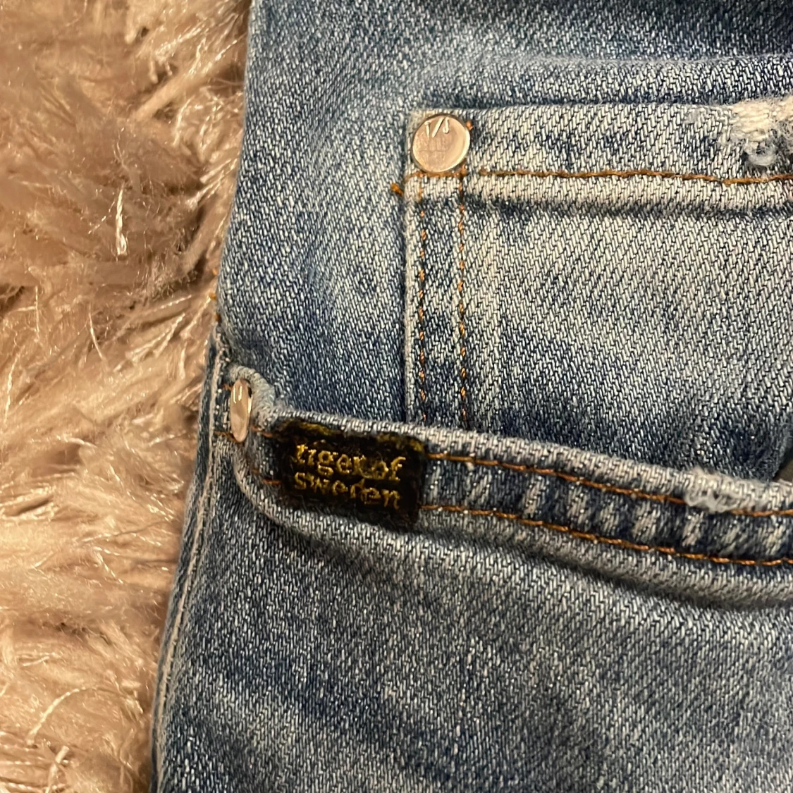Snygga blå jeans från Tiger of Sweden med klassisk femficksdesign och knappgylf. Tillverkade i Italien, dessa jeans har en stilren look med lätt slitna detaljer för en trendig touch.