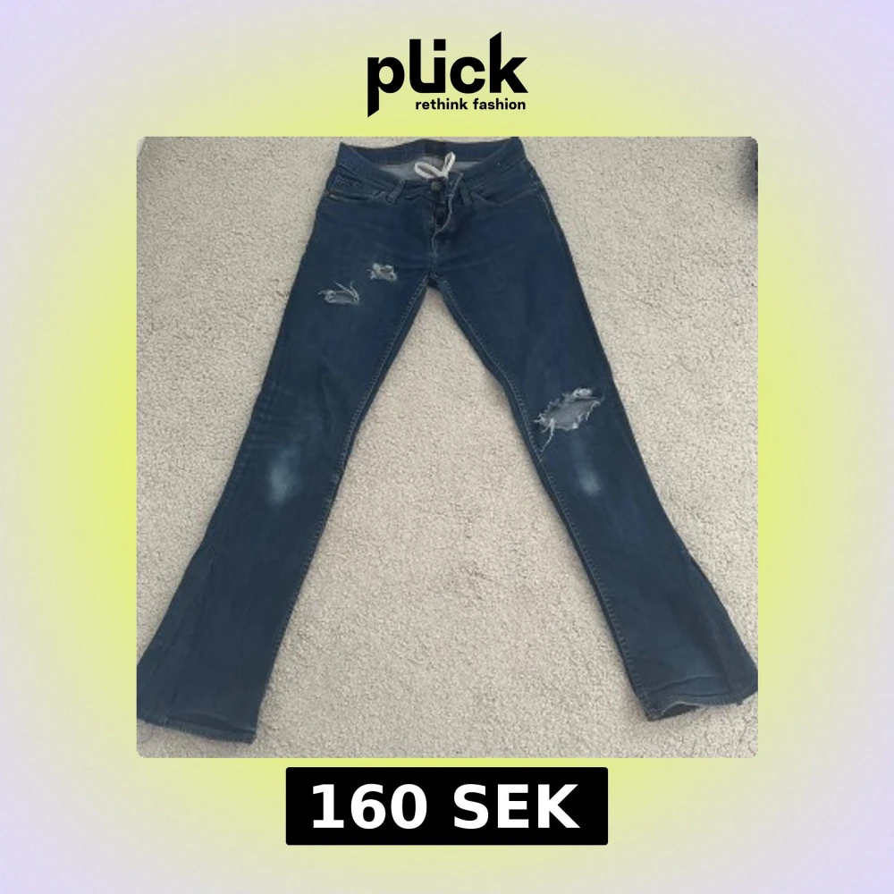 Snygga blå jeans från Tiger of Sweden med slitna detaljer och en klassisk femficksdesign.Lite slitningar vid knappen!Innerbensens längd 75 cm, midjemått rakt över 34 cm