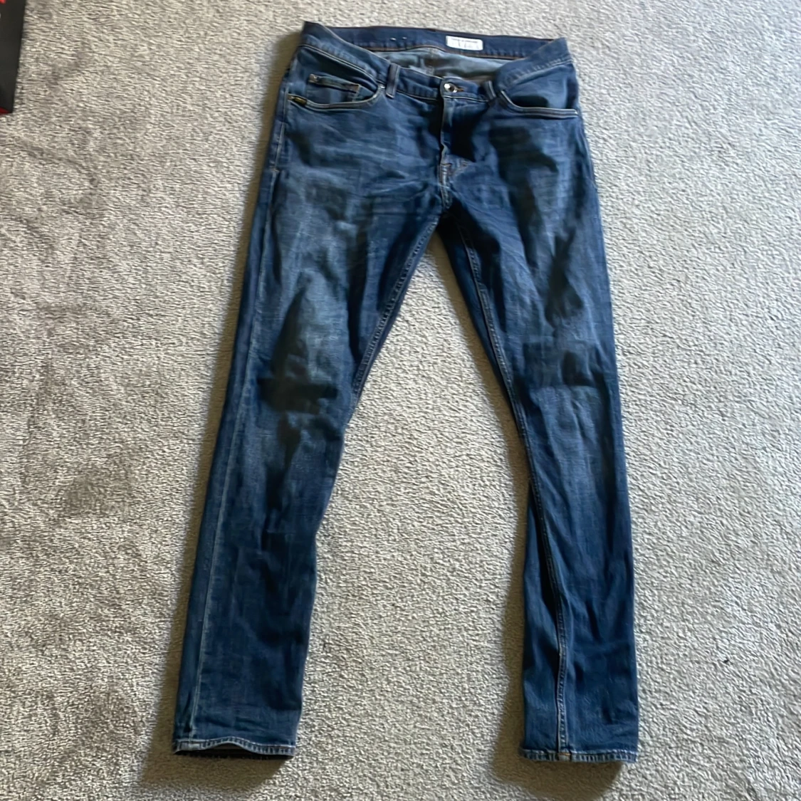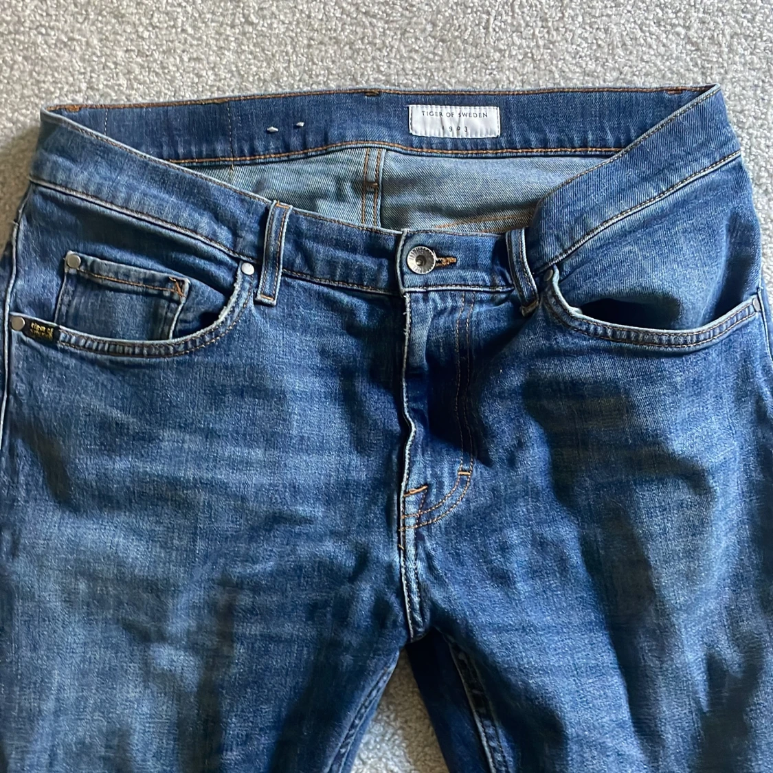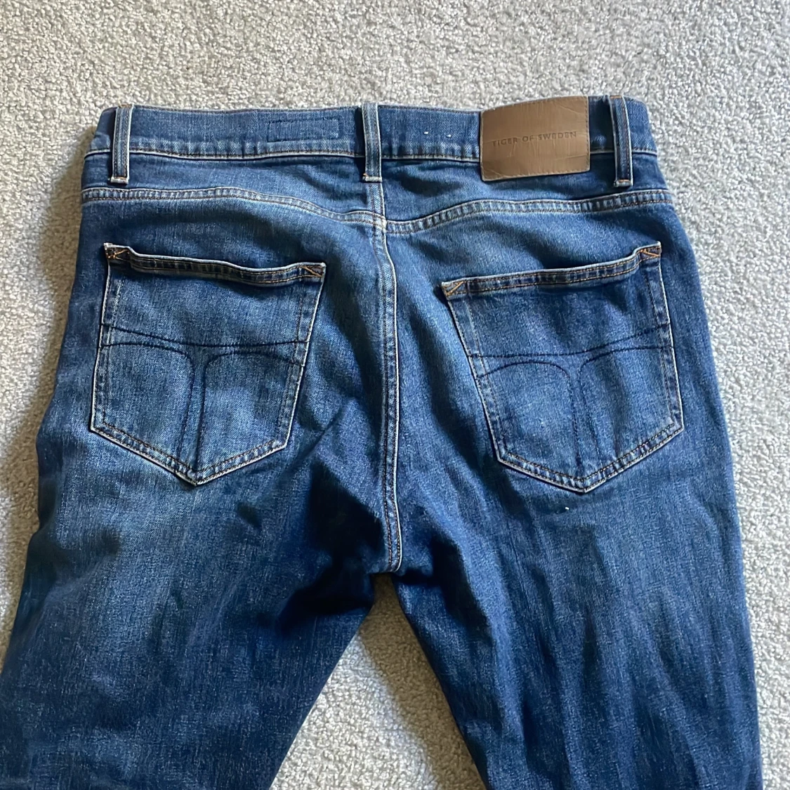 Snygga blå jeans från Tiger of Sweden med klassisk femficksdesign och läderpatch bak i midjan. Jeansen har smal passform, raka ben och är tillverkade i mjukt denimtyg med lätt tvättad look. Perfekta för dig som gillar stilrena och tidlösa jeans.