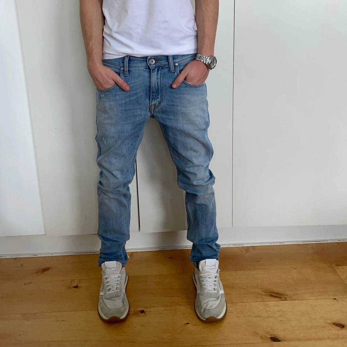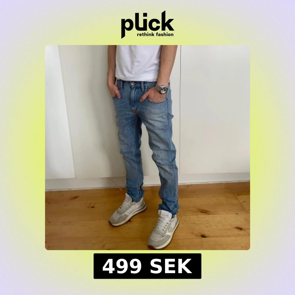 Snygga ljusblå jeans med en schyssta slitningar. De har en klassisk femficksdesign och knappar i midjan. Perfekta för en casual look. Skick 9/10. Modellen 177. W29L34