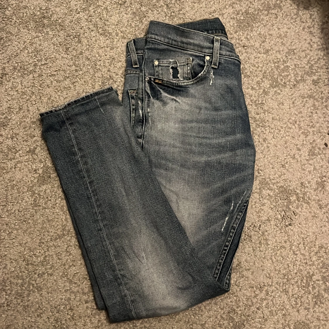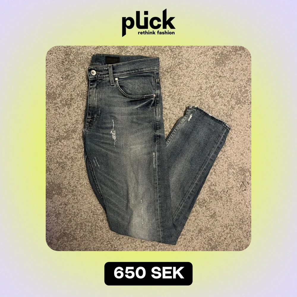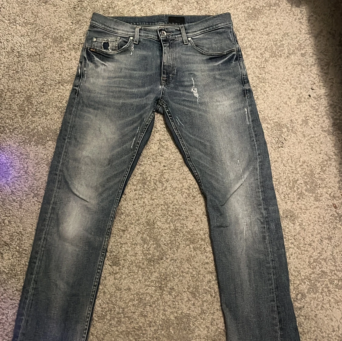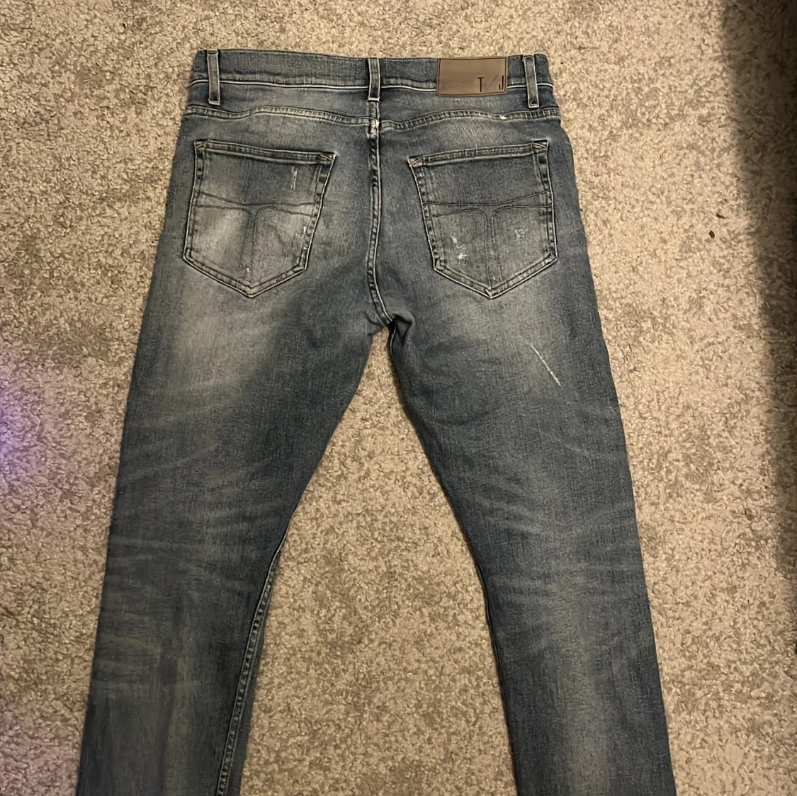 Säljer ett par gråblå jeans i bra skick med feta slitningar för en avslappnad look. Märke Tiger of sweden med modell pistolero.