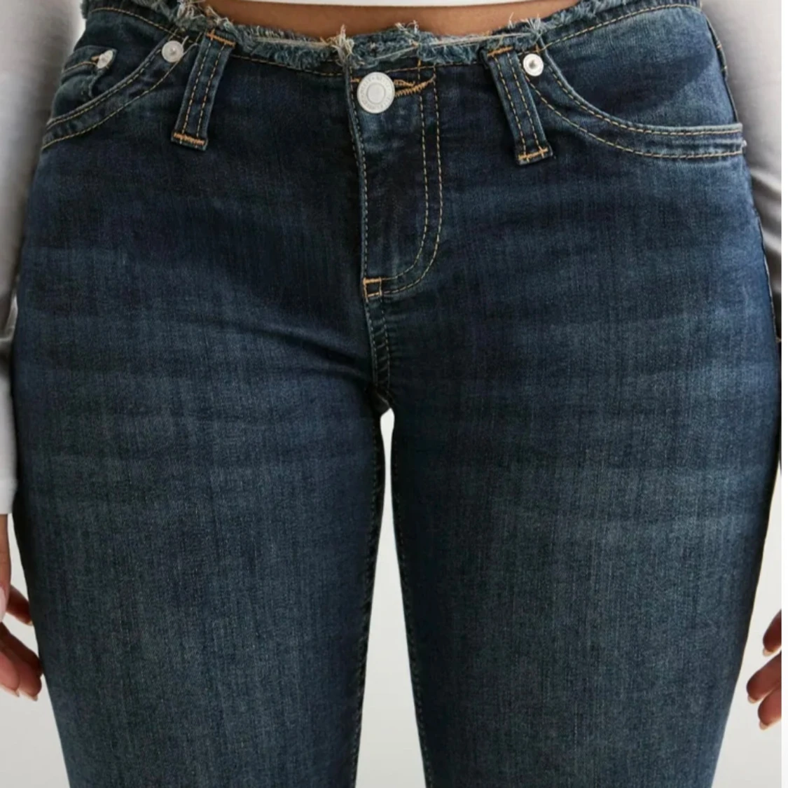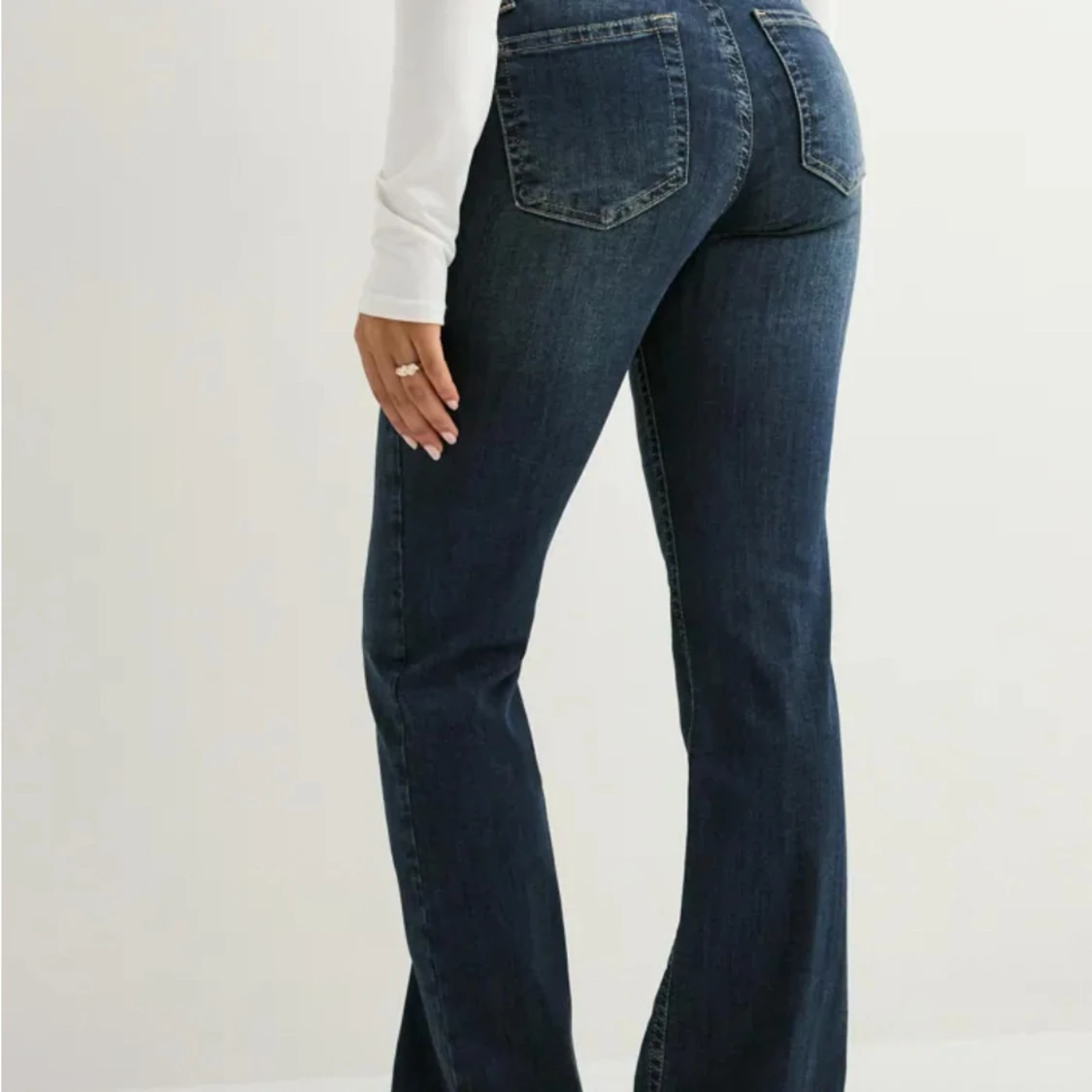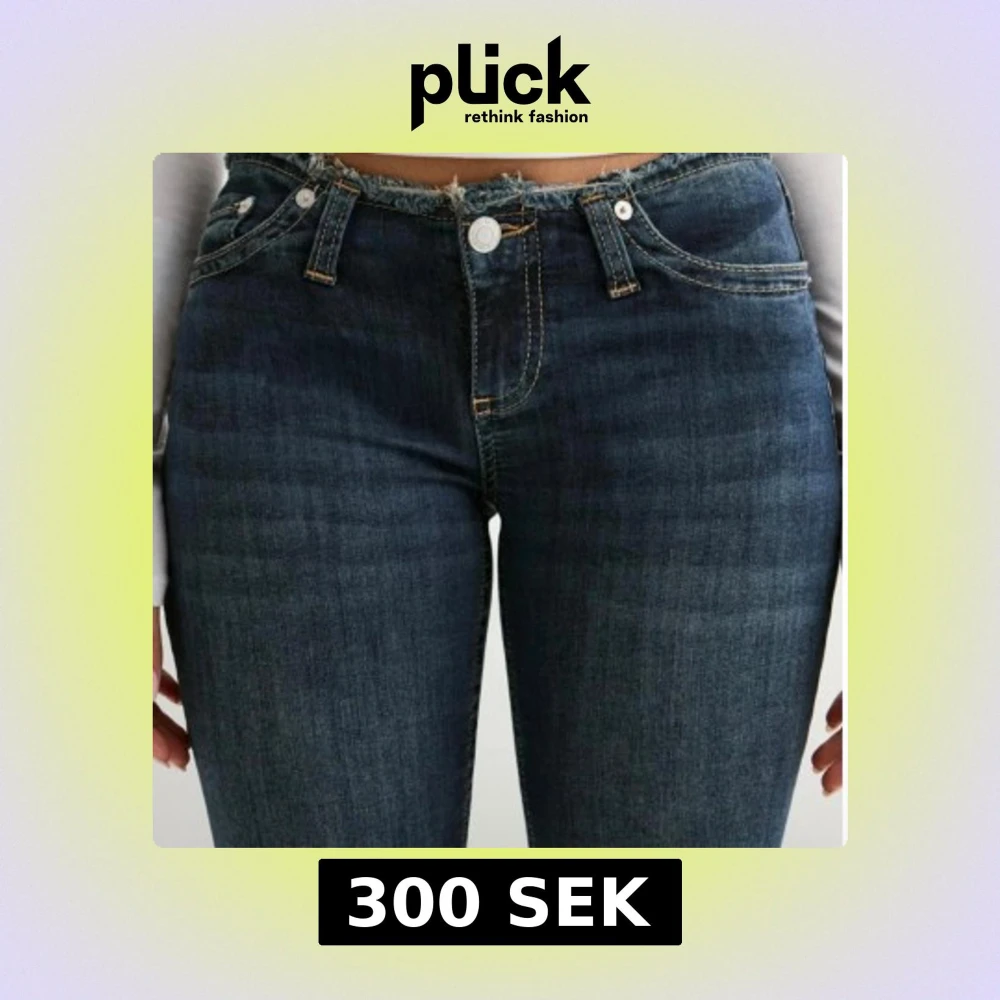 Snygga mörkblå jeans med bootcut passform och låg midja. Jeansen har en rå, fransad kant upptill och klassiska fickor både fram och bak. Materialet är stretchigt denim som sitter skönt och markerar siluetten. Skriv för fler bilder! (NYPRIS 699 kr)