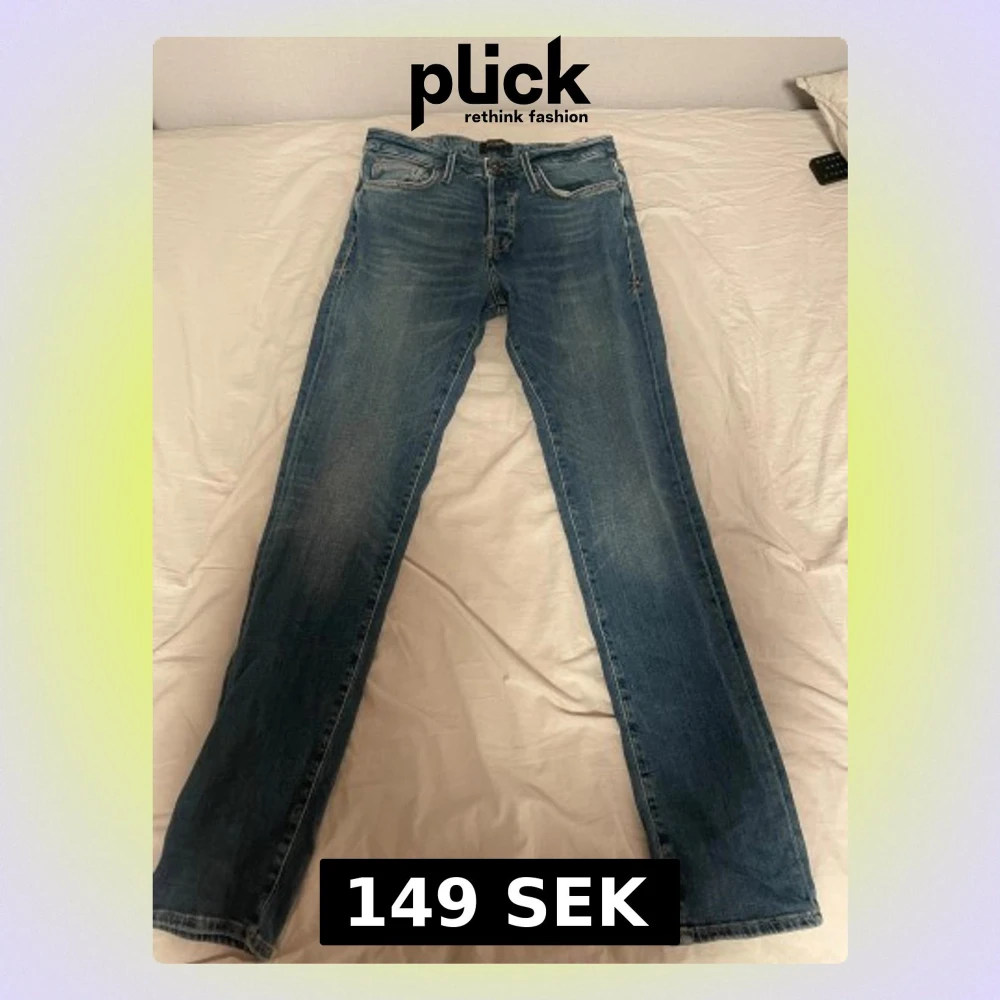 Säljer ett par klassiska blå jeans från Jack & Jones med snygg tvätt och raka ben. Jeansen har fyra fickor, bälteshällor och gulbruna sömmar. Materialet är bomull och jeans, vilket gör dem både slitstarka och bekväma. Perfekt för dig som gillar enkel och tidlös stil.