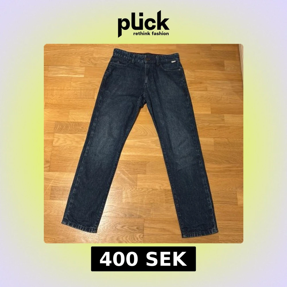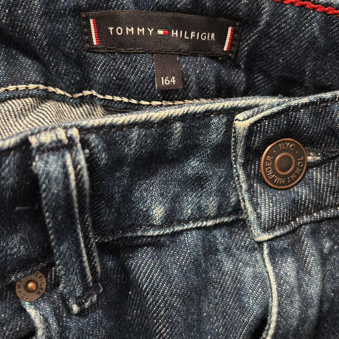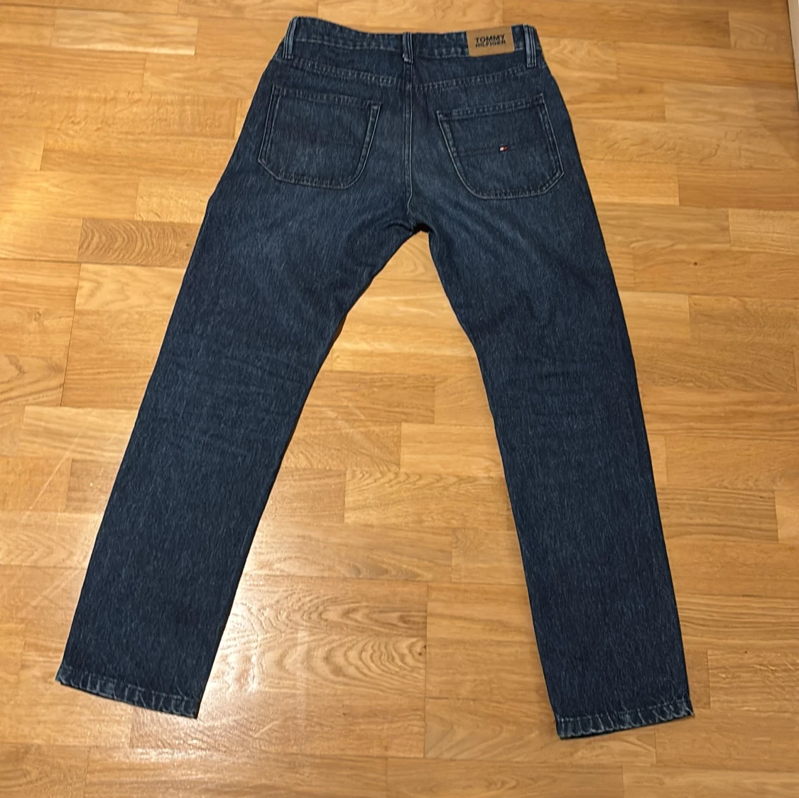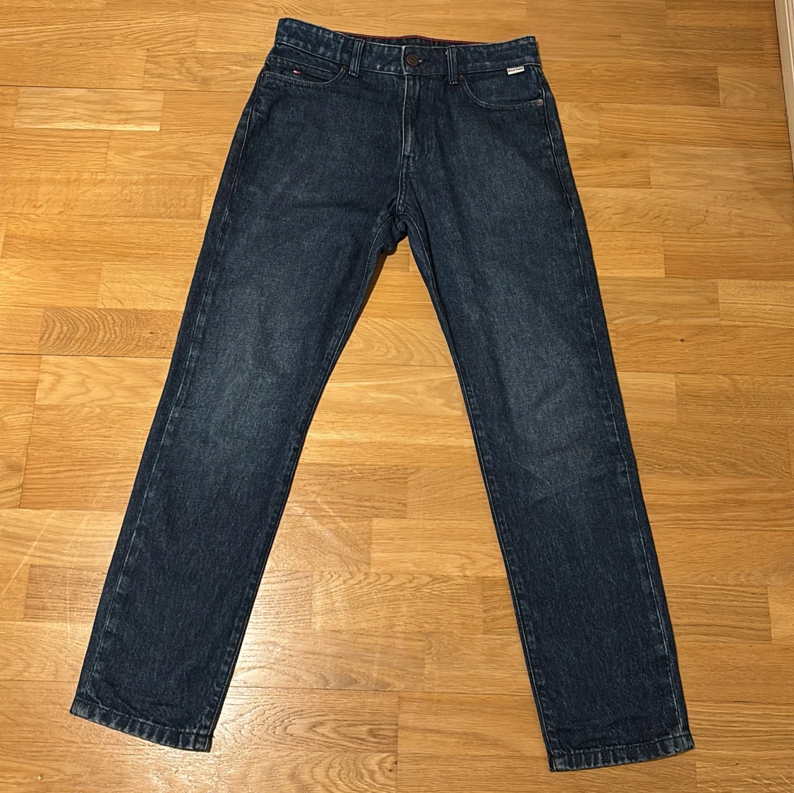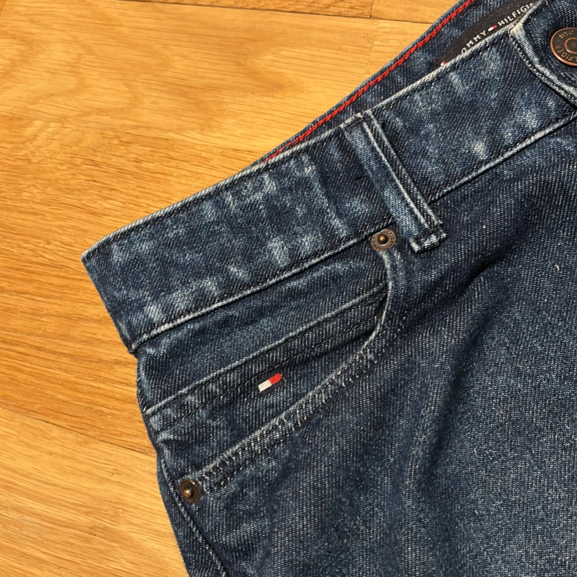 Snygga blå jeans från Tommy Hilfiger i rak modell. Klassisk femficksdesign med logga på fickan och knapp. Jeansen är i ett mörkare blått denimtyg med subtila slitningar och röda detaljer på insidan av linningen.