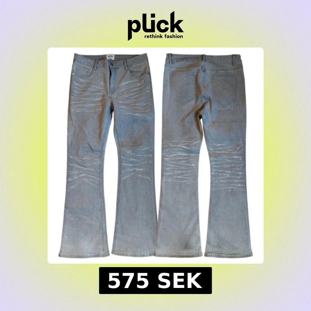 Säljer ett par gråa bootcut byxor från MIJKO Creative Collection. Jeansen har coola ljusa slitningar framtill och bak, klassisk femficksmodell och stängs med dragkedja och knapp. Perfekta för dig som gillar unik denimstil. Strlk M passar mig med W30-32