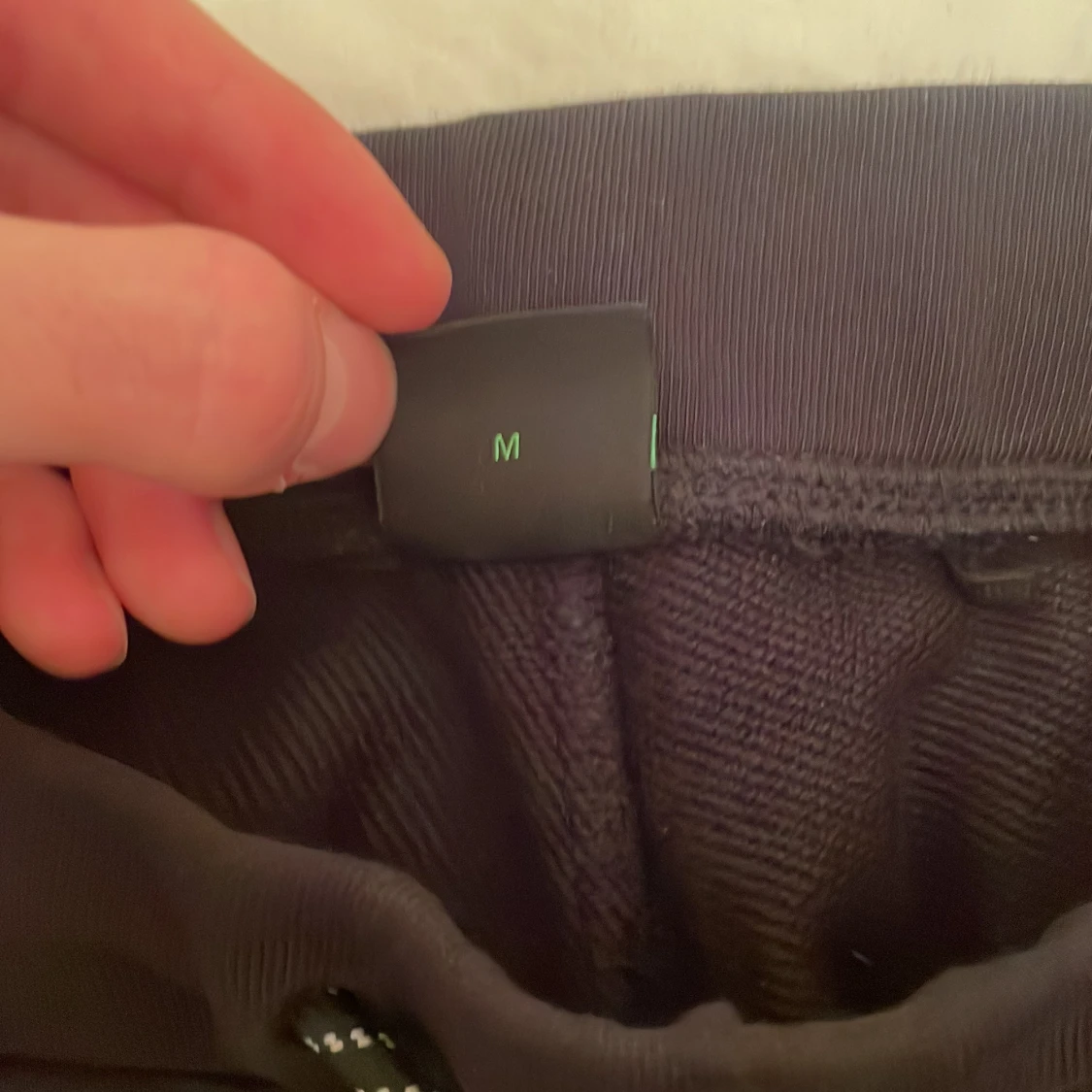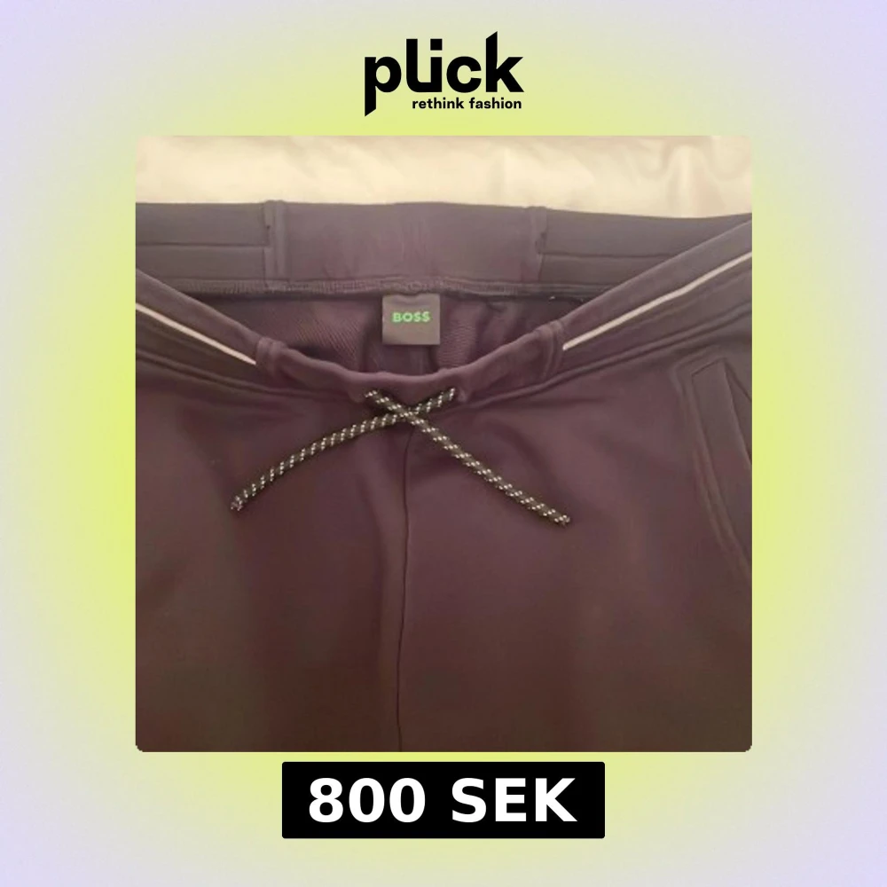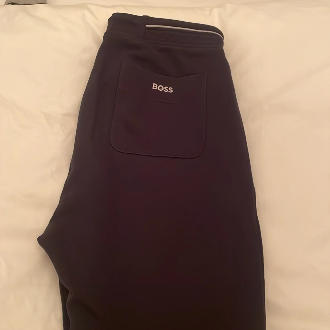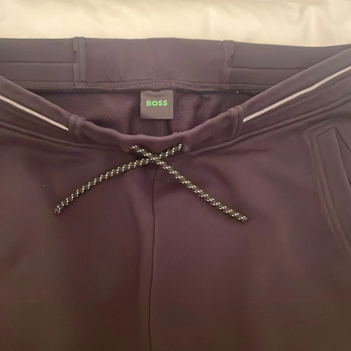 Snygga svarta mjukisbyxor från Boss med snörning i midjan och en bakficka med logotyp. Perfekta för en avslappnad stil. Hela tracksuiten för 1200, koftan är storlek S och byxorna storlek M.