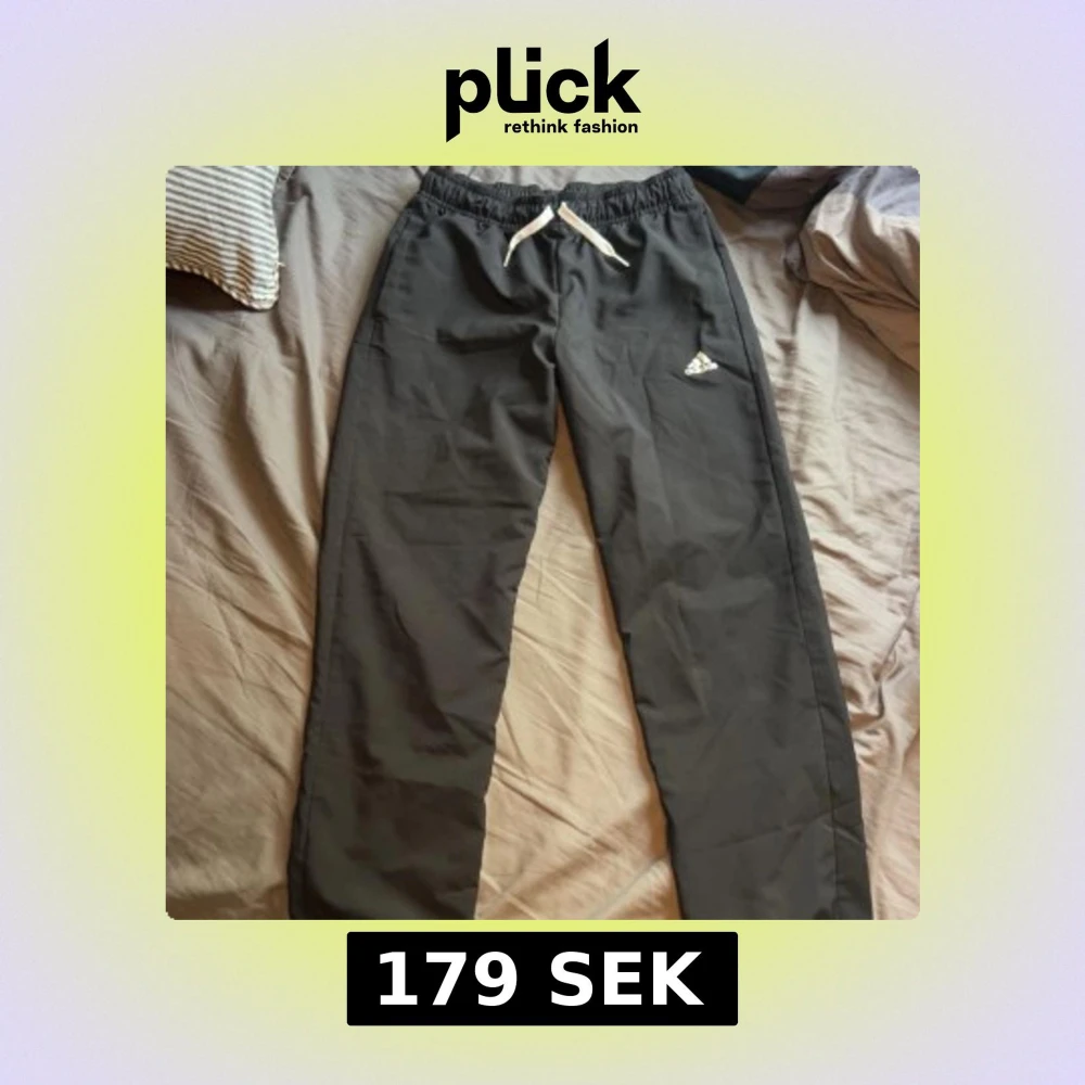 Svarta träningsbyxor från Adidas med vit dragsko i midjan och klassisk Adidas-logga på låret. Byxorna har elastisk midja och är tillverkade i ett lätt och bekvämt syntetmaterial, perfekta för sport eller chill. Snygg och enkel design som funkar till det mesta.