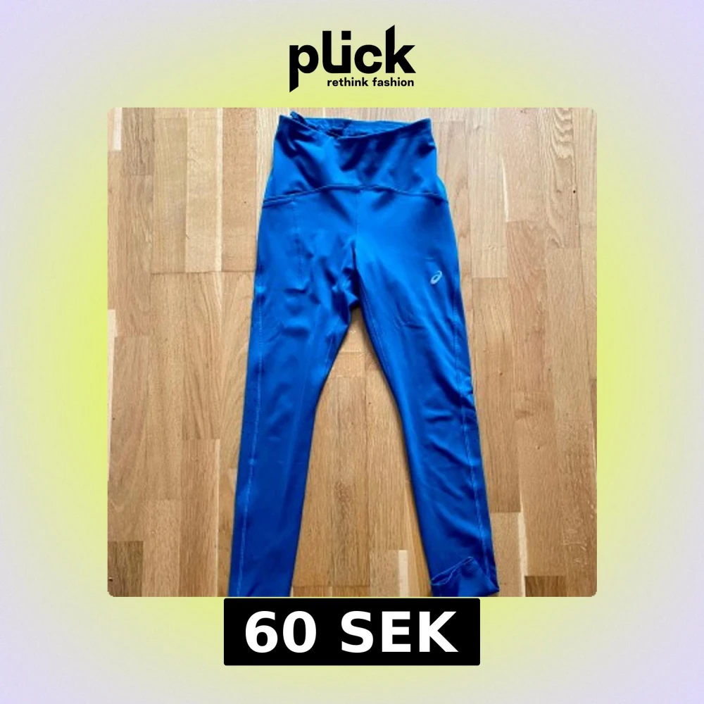 Snygga blå/gröna träningstights från Asics med hög midja och snörning. Perfekta för löpning eller gymmet! Litet hål på ena sidan, se sista bilden.
