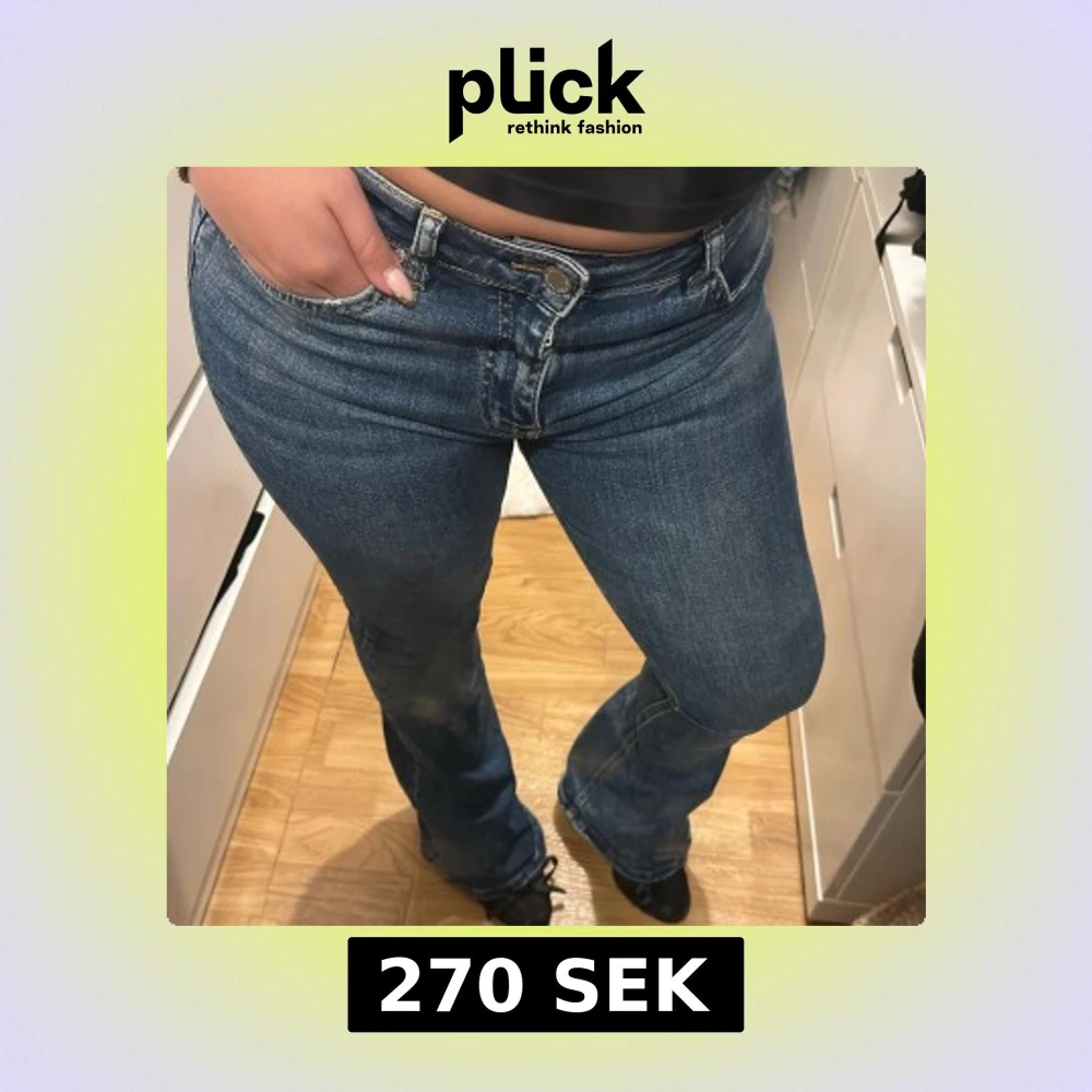 Snygga blå bootcut jeans från ginatricot. De har en klassisk femficksdesign och en bekväm passform. Perfekta för en avslappnad stil. Storlek M men passar mig med S, säljer då de är för långa på mig som är 152