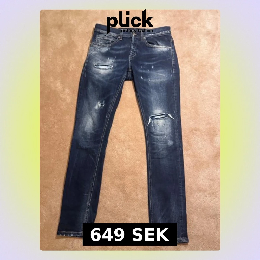 Säljer ett par mörkblå skinny jeans från George med slitningar och trasiga detaljer på benen. Jeansen har klassisk femficksdesign, orange sömmar och skinny fit som sitter tajt längs benen. Perfekt för dig som gillar en edgy och modern look. Skick 9.5-10. Nypris 4000kr Mitt 649kr Storlek 32