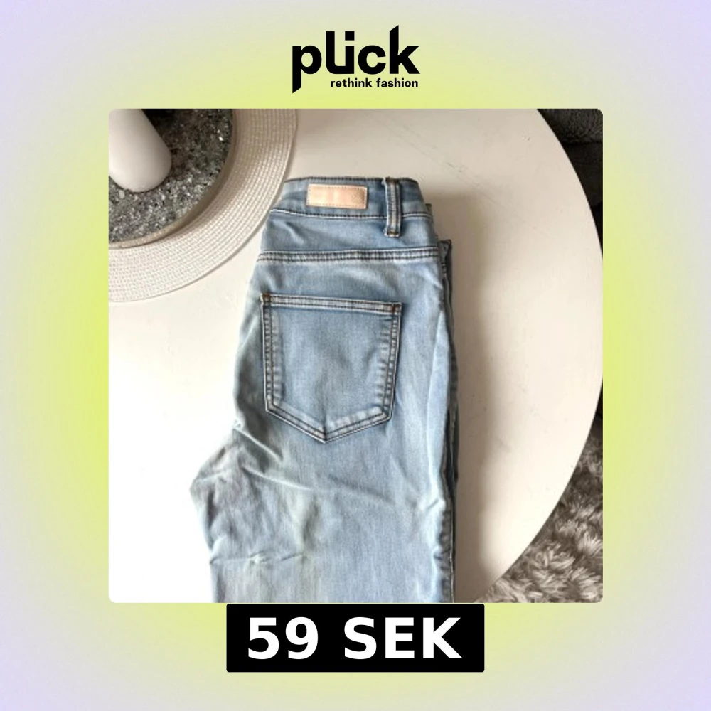 Säljer ett par ljusblå jeansbyxor med klassisk femficksdesign och knappgylf. Byxorna har en normal passform och är perfekta för en avslappnad stil. De är tillverkade i ett mjukt och bekvämt denimtyg.